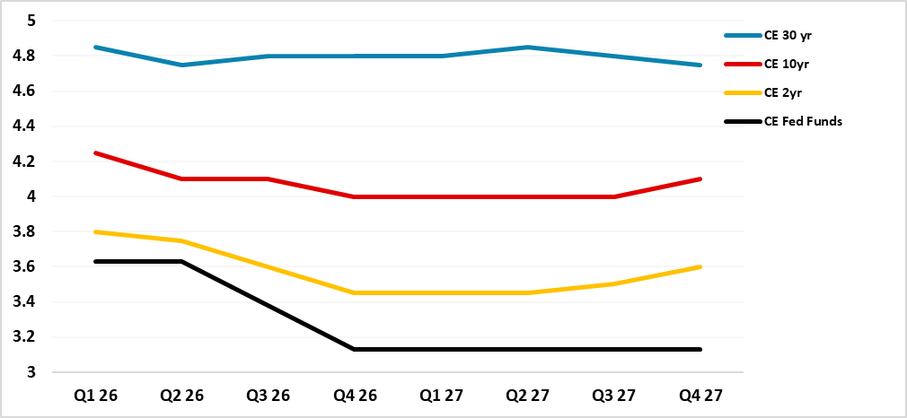 Figure 11: Fed Funds, 2, 10 and 30yr U.S. Treasury Yields Forecasts (%)