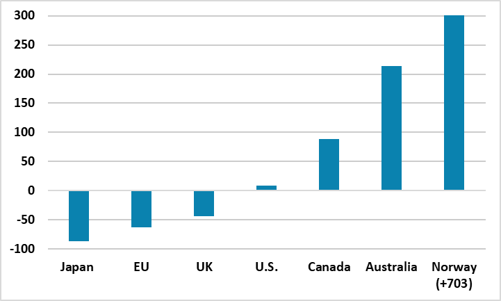 In DM FX, further USD strength initially on super high oil prices may not last if U.S. equities enter a major risk off phase and come down to 5500-6000. Then we could see the USD losing ground. It could get whipsawed against the JPY that is very oversold. Our favorites were the AUD and NOK based on yield spreads, but it is also worth noting they are net energy exporters (Figure 14) and helped if energy prices remain elevated. We also like these countries as they are fiscal saints compared to the U.S./UK or France (here) and more appealing in a crisis.