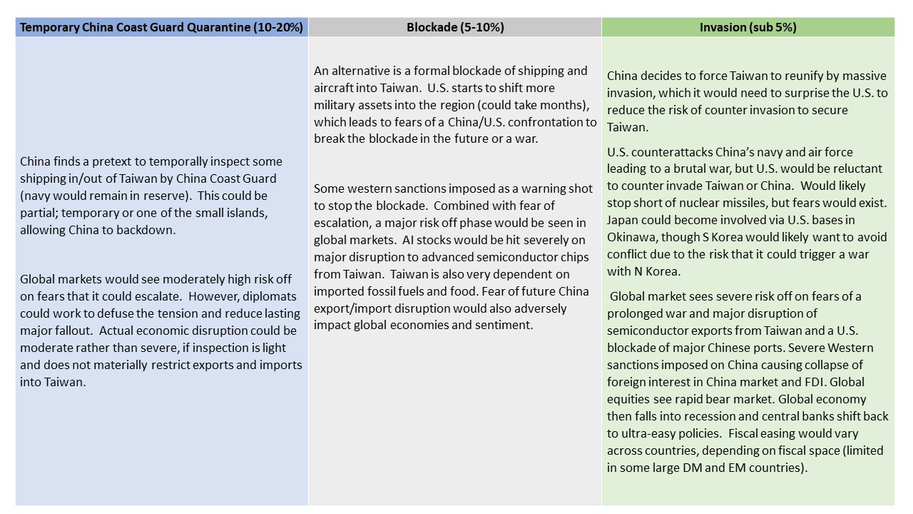 · Any of the alternative scenarios (Figure 1) would cause global risk off in financial markets on fears it could lead to a China-U.S. war and on fears of the disruption of advanced semiconductor chips exports to the global economy and for AI development. Western sanctions would likely be imposed on a blockade, but would be more severe in a scenario of invasion. The adverse economic impact on China would be severe in the scenario of an invasion.