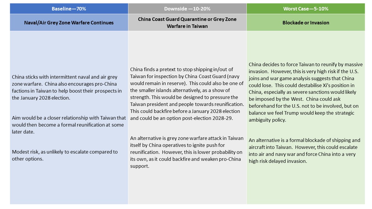 Our baseline (Figure 1) for 2026 and 2027 remains that China maintains the existing air and naval grey zone warfare, which is low risk for China. We have the probability of an invasion or full blockade in 2027 at 10%, but have the temporary China Coast Guard quarantine option at 10-20% -- this could be Taiwan as a whole or one of its islands, as occurred in the 1950s. The probabilities are likely lower in 2026, as Xi could try to convince Trump a couple of times in 2026 to weaken the strategic ambiguity policy.