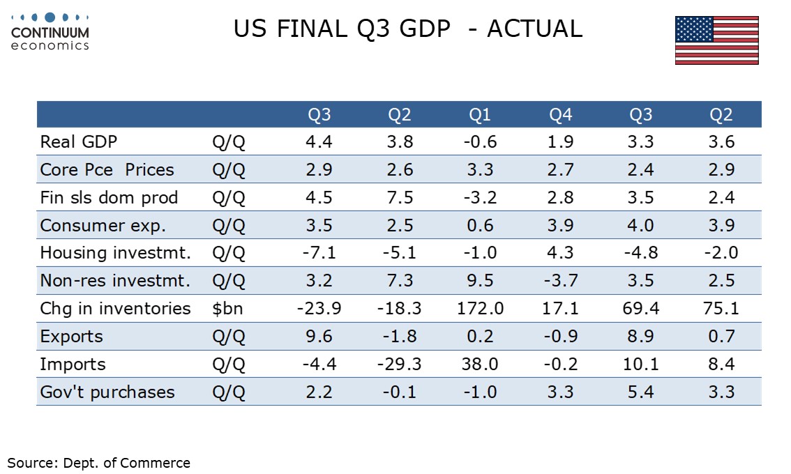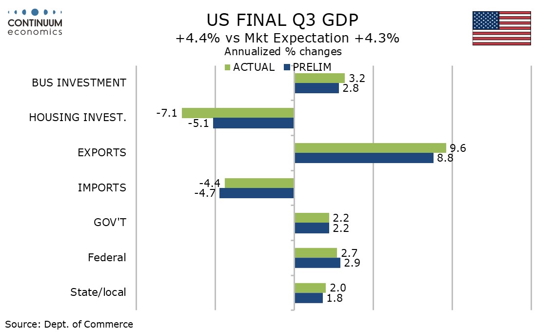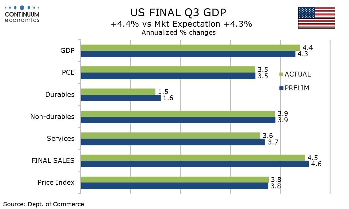 Initial claims remain low in the survey week for January’s non-farm payroll, rising by only 1k to a lower than expected 200k. The Q3 GDP revision to 4.4% from 4.3% is marginal, but is even stronger than an already strong pace.