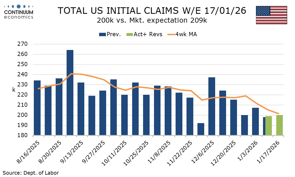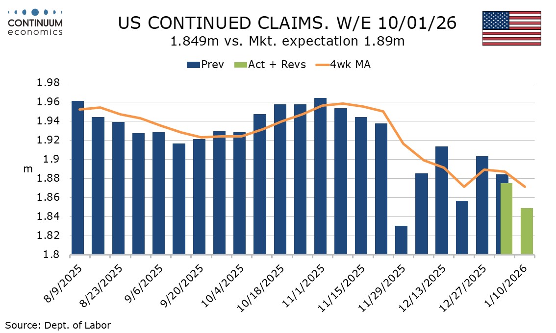 Continued claims cover the week before initial claims and are also lower than expected, falling by 26k to 1.849m. This is a 6-week low. The 4-week average of 1.871m matched that of three weeks ago and lower has not been seen since April 2025.