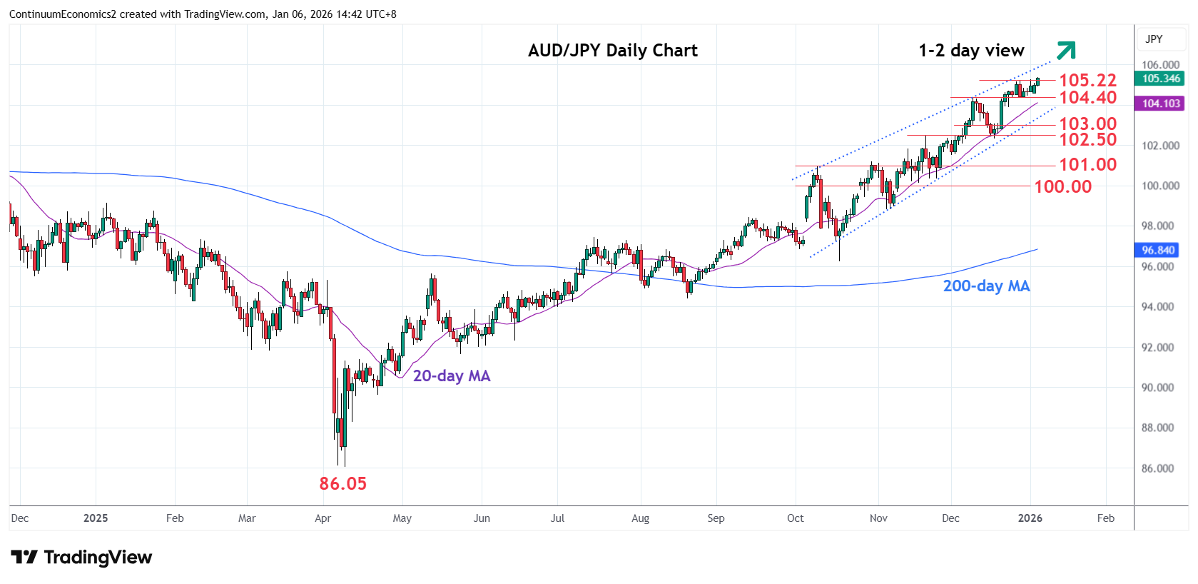 06:40 GMT - Consolidation below the 105.22 high has given way to break to extend gains from the April 2025 year low. Bullish price action keep pressure on the upside and see room for extension to the 106.00 level next. Higher still, will see scope to 107.00/108.00 area but overbought daily and weekly studies caution corrective pullback within the rising wedge pattern. Meanwhile, support at the 104.40/104.00 area underpin. Would take break here to fade the upside pressure and open up room for deeper pullback to strong support at the 103.00 congestion and 102.50/00 area.