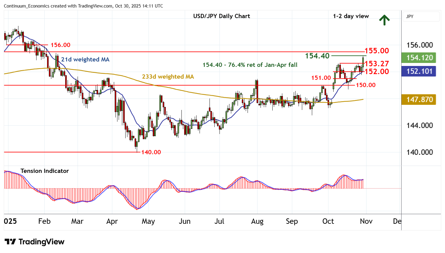 13:55 GMT - Cautious trade around 152.00 has bounced sharply higher in both USD- and JPY-driven trade, with prices currently consolidating the test of strong resistance at the 154.40 Fibonacci retracement. Daily readings have ticked higher and broader weekly charts are positive, highlighting room for further strength in the coming sessions. A close above here will improve sentiment and extend April gains towards congestion around 155.00. Beyond here is the 155.88 high of February and congestion around 156.00. But flat overbought weekly stochastics are expected to limit any tests of here in profit-taking/consolidation. Meanwhile, support is raised to the 153.27 weekly high of 10 October. A close beneath here, if seen, would turn sentiment neutral and prompt consolidation above congestion around 152.00.