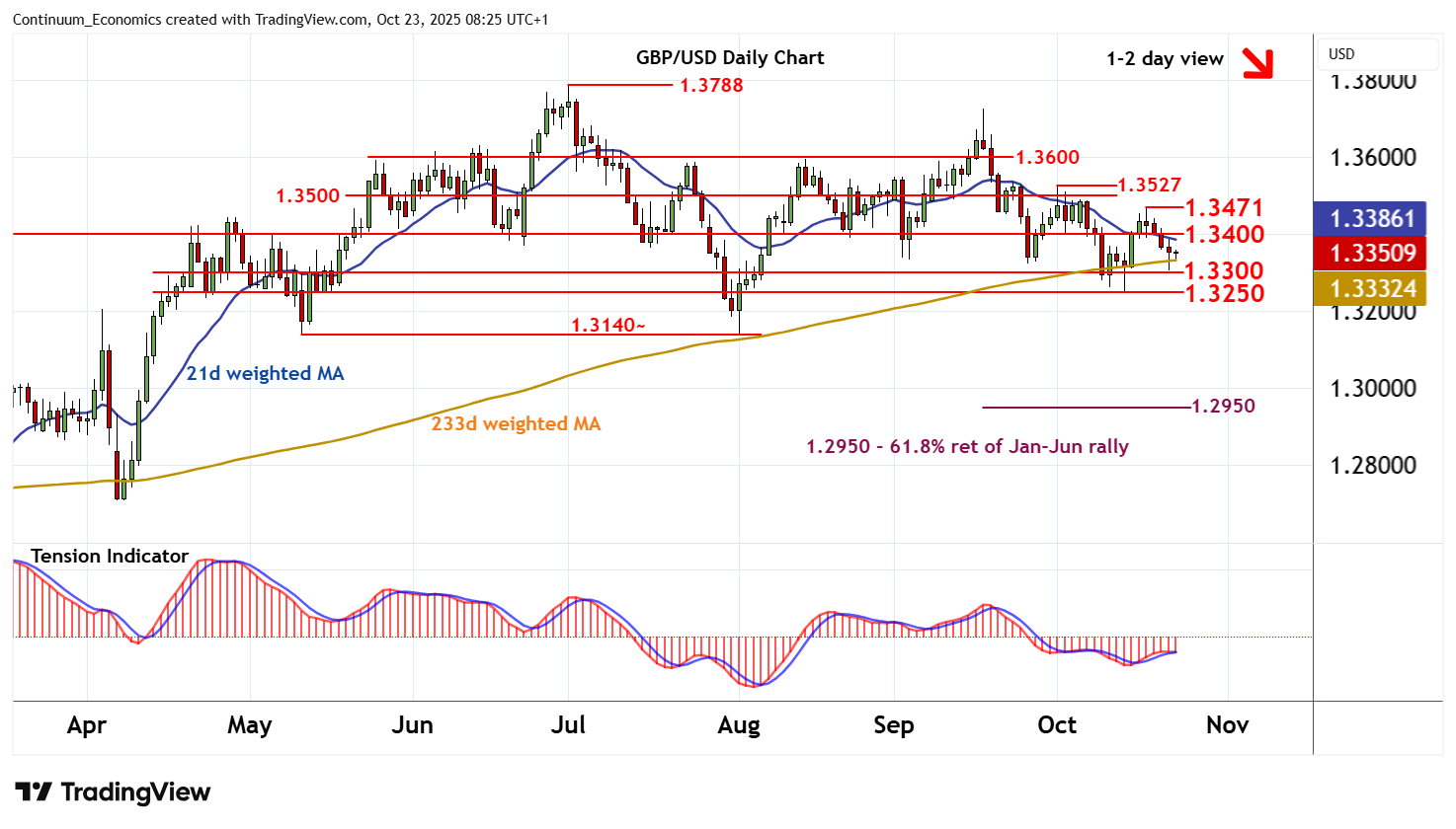 08:10 BST - The anticipated break below congestion support at 1.3300 has not been seen, as unwinding oversold intraday studies prompt a smart bounce into choppy trade around 1.3350. Daily readings continue to deteriorate and broader weekly charts are negative, highlighting room for fresh losses in the coming sessions. A later break below 1.3300 will open up further congestion around 1.3250. Continuation of mid-September losses towards 1.3200 cannot be ruled out. Meanwhile, resistance remains at congestion around 1.3400. A close above here, if seen, would help to stabilise price action and give way to consolidation beneath the 1.3471 weekly high of 17 October.