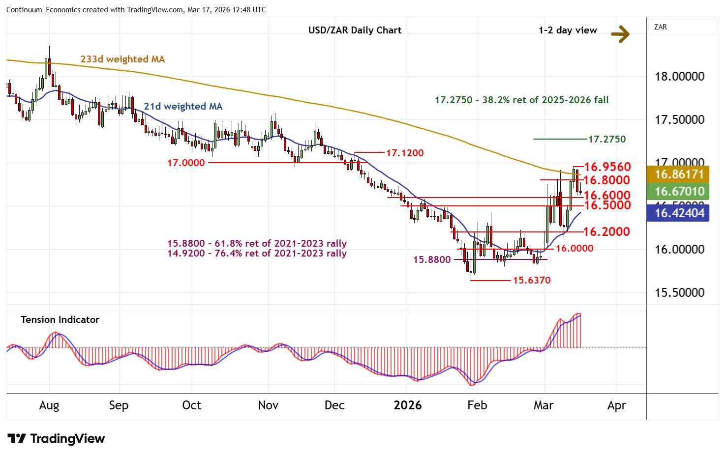 12:05 GMT - Anticipated losses are giving way to consolidation above support within the 16.5000 - 16.6000 range, with prices currently trading around 16.6850. Overbought daily stochastics are ticking lower and the positive daily Tension Indicator is flattening, suggesting room for a test of here. But rising weekly charts should limit any break in renewed buying interest above congestion support at 16.2000. Meanwhile, resistance is at congestion around 16.8000 and extends to the 16.9560 current year high of 13 March. A close above here, not yet seen, will turn sentiment positive and extend late-January gains beyond further congestion around 17.0000 towards the 17.2750 Fibonacci retracement.