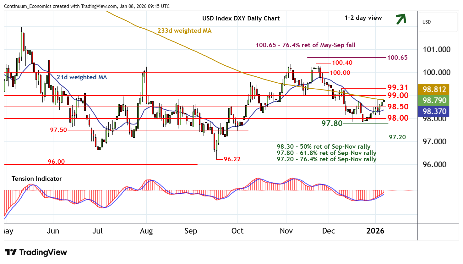 09:05 GMT - No change to the modestly positive tone, as intraday studies continue to rise, with prices extending gains to currently trade around 98.80. Positive daily readings highlight room for a break above here towards the 99.31 weekly high of 9 December. But already overbought daily stochastics and bearish weekly charts are expected to limit any tests of this 99.00/31 range in renewed selling interest. Meanwhile, support remains at congestion around 98.50 and should underpin any immediate setbacks.