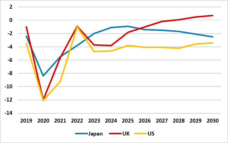 More importantly, the UK political situation remains fractured but fluid, with the government low in the opinion polls. Though a general election is not scheduled until 2029, the situation is so bad that pressure will likely grow in 2026 and 2027 to replace PM Starmer and Chancellor Reeves unless they avoid big losses in the May local and Scottish parliament election. Bookmakers show moderately high odds that they could be replaced in 2026. On the economy, the Conservatives are more trusted by voters, while Reform are more trusted on asylum and immigration and Labour on healthcare (Figure 4 for overall view on issues). However, the situation is fluid, as net immigration is projected to show a further sharp fall in 2026. Additionally, though Reform is seeing defections from the Conservatives and stands high overall in the opinion polls, political analysts note that Reform lags the other main parties on major issues excluding asylum and immigration – this could mean protest for now, but switch to traditional parties in a general election. For 2026, this means a risk premium for 10yr Gilt yields in case Starmer and/or Reeves are replaced and this leads to a softening of the fiscal rules – though in reality the 2022 Truss crisis means this would be modest rather than large.