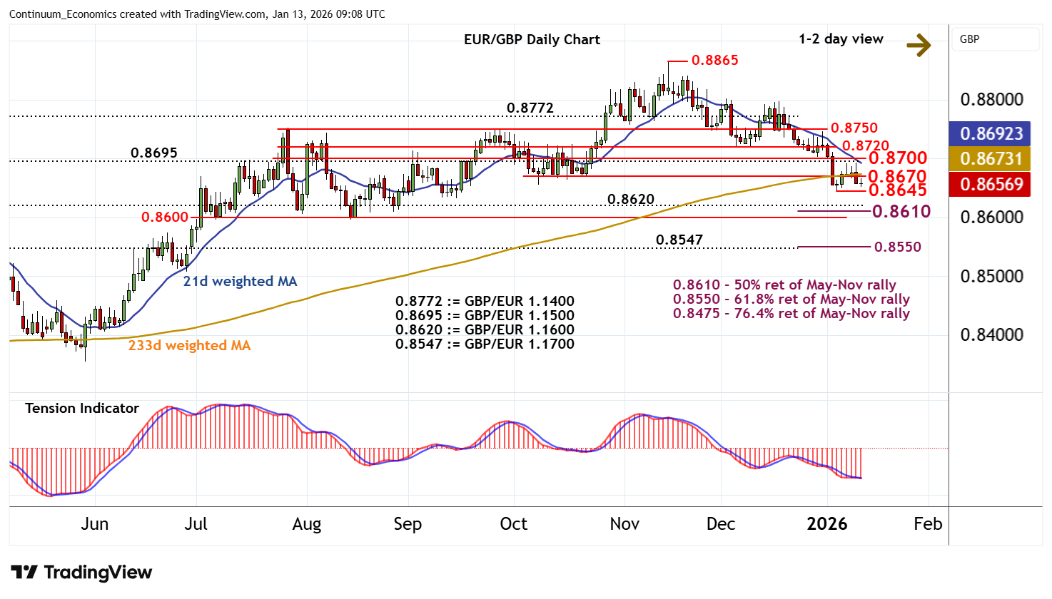 08:45 GMT - The anticipated test of resistance at 0.8695, (GBP/EUR 1.1500), and congestion around 0.8700 has been pushed back, with steady selling interest giving way to consolidation above strong support at the 0.8645 current year low of 6 January. Daily readings have turned mixed/negative and broader weekly charts are bearish, highlighting room for fresh losses in the coming sessions. But a close beneath here is needed to turn sentiment negative and extend November losses towards strong support within 0.8600/20. Meanwhile, resistance is lowered to the 0.8670 range lows from October and extends to 0.8695/00. This range should cap any immediate tests higher.