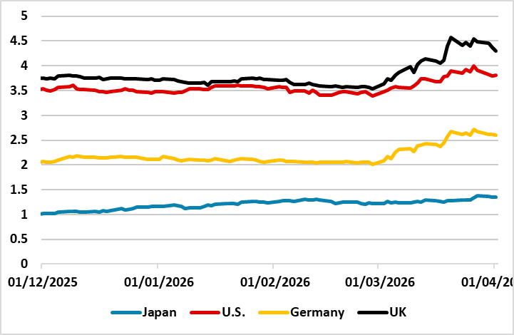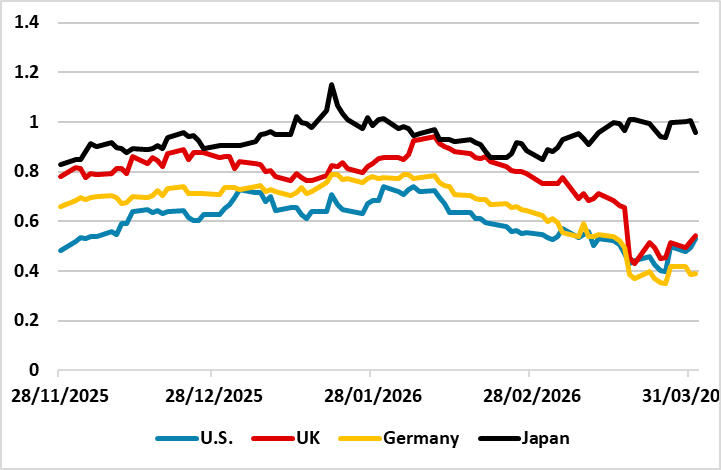 · What next? The Fed on April 29/ECB on April 30/BOE on April 30 will be of great interest for further guidance on central bank thinking. By these dates it should also be clearer whether the Iran war is 4-8 weeks or moving to a more prolonged 2-6 month war. The latter can deliver further increase in oil prices, as current oil prices are being restrained by the 400mln barrels IEA release, which is unlikely to be repeated once strategic reserves are reduced. On our baseline of 4-8 weeks, we would expect caution but a further dampening down on interest rate hike fears as seen from BOE Bailey and ECB Schnabel in recent days. However, incoming data will also inform the debate, with the March U.S. CPI likely to be closely watched (here) but the March EZ CPI data (here) providing comfort that the 1st round effects in EZ this time are likely to be modest compared to 2022 – EZ natural gas prices are currently 1/6 of the Ukraine war peak. However, we attach a 30% probability to a 2-6 month war, which could see USD150 oil prices; greater risk of 2nd round effects and real risk of ECB/BOE rate hikes -- the Fed would likely find it difficult to hike rates. This week is key, with Trump's threat of an attack on Wednesday. A major attack of all Iran power plants would see large scale retailation from Iran and likely pivot the war scanario to 2-6 months. Thus 2yr yields will likely remain choppy this month, depending on sentiment towards the war length.