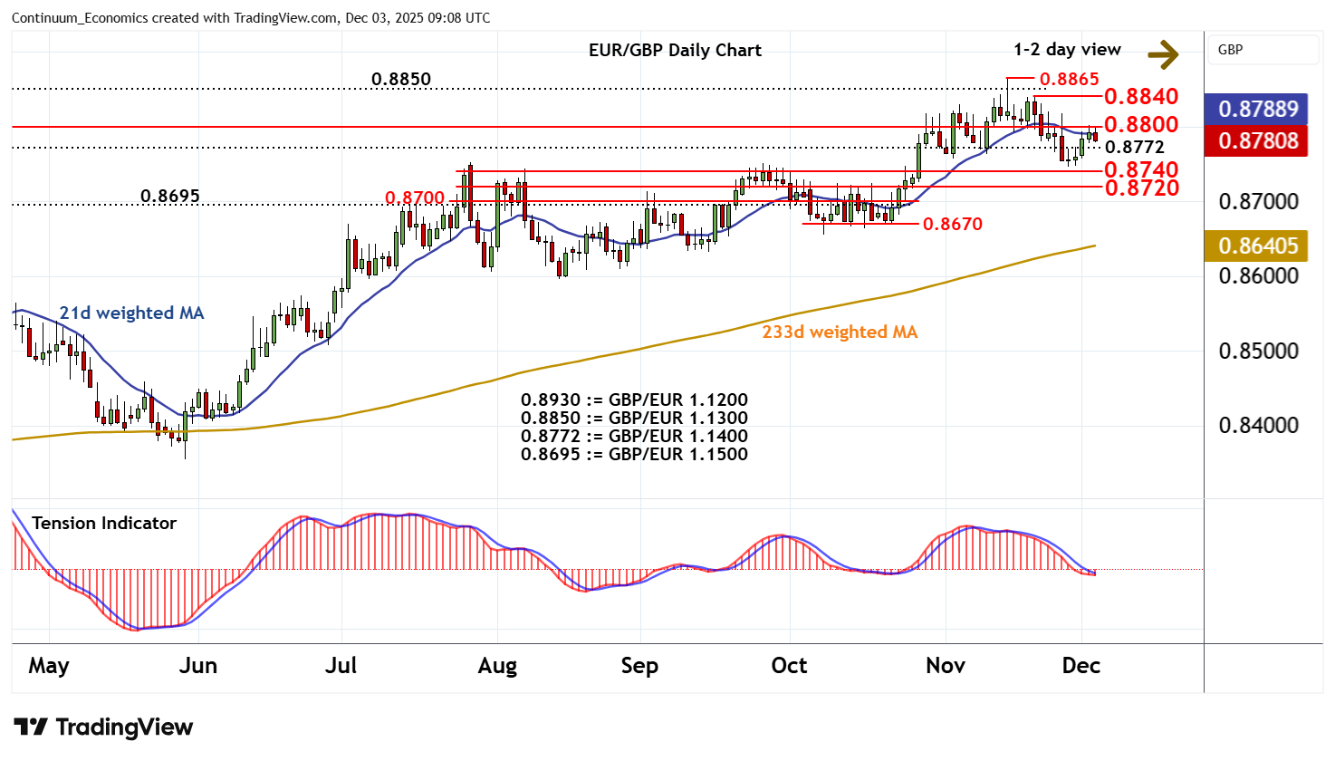08:55 GMT - The test of resistance at the 0.8800 break level is giving way to a minor pullback, as overbought intraday studies unwind, with prices currently trading around 0.8780. A test of support at 0.8772, (GBP/EUR 1.1400), cannot be ruled out. But mixed daily readings should limit any break in renewed consolidation above support within the 0.8720/40 range. Meanwhile, negative weekly charts should limit any tests above 0.8800 in renewed selling interest/consolidation beneath resistance at the 0.8840 weekly high of 20 November and 0.8850, (GBP/EUR 1.1300).