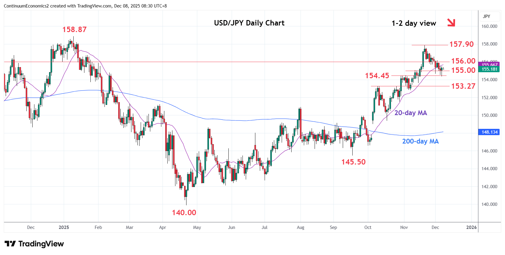 00:30 GMT - Still limited below the 155.00 level as prices extend consolidation at the 155.00/154.45 support. Prices are unwinding oversold intraday studies but consolidation here is expected to give way to eventual break to extend losses from the 157.90, November current year high. Break will see room to the strong support at the 154.45/154.00, October high and congestion area. Lower still, will open up room for deeper pullback to support at the 153.27/152.80 area. Meanwhile, resistance at the 156.00 congestion is expected to cap bounce attempt.