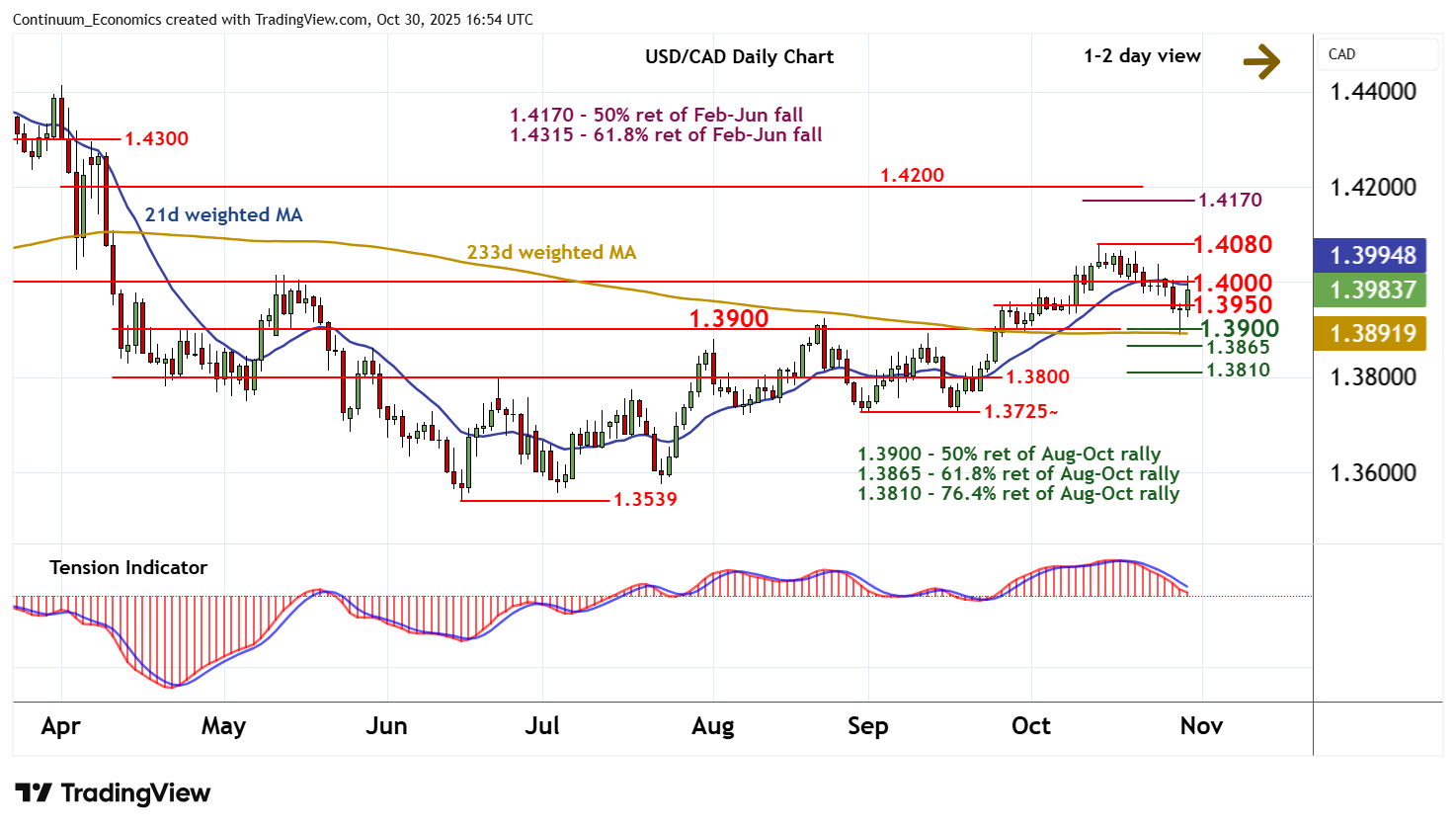 16:20 GMT - Choppy trade around strong support at 1.3900 has given way to a sharp USD- and CAD-driven bounce, with prices currently consolidating the test of resistance at 1.4000. Oversold daily stochastics are unwinding, highlighting room for a retest above here. But the negative daily Tension Indicator and deteriorating weekly charts should limit scope in renewed selling interest towards strong resistance at the 1.4080 weekly high of 14 October. In the coming sessions, cautious trade is expected to give way to fresh losses. Immediate support is at 1.3950. But a close below 1.3900 will add weight to sentiment and extend losses towards the 1.3865 Fibonacci retracement. Beneath here is 1.3800/10, where already oversold daily stochastics could prompt consolidation/short-covering.