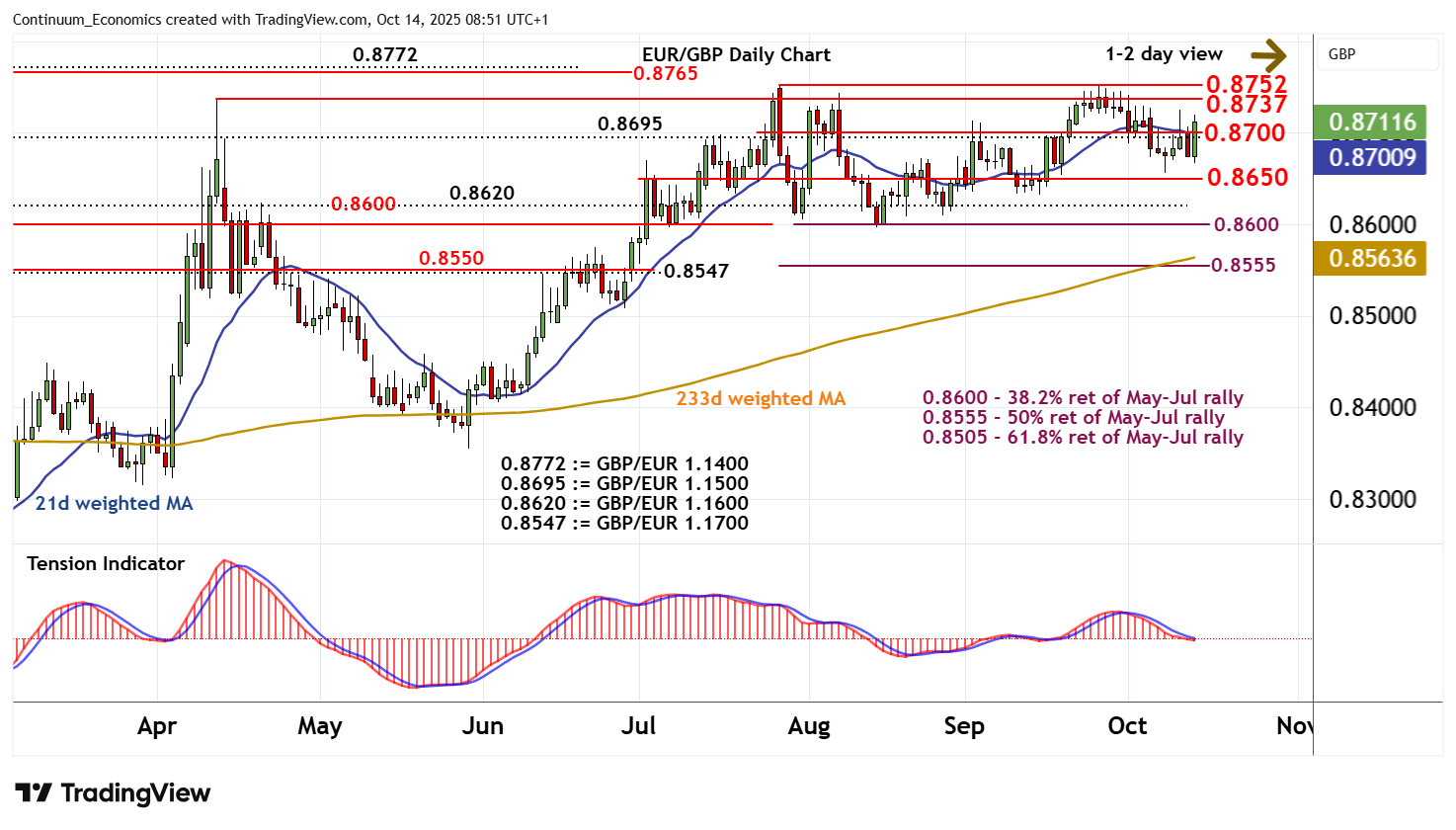 08:45 BST - Consolidation just below 0.8695/00 has given way to a sharp GBP-driven bounce, with prices currently trading around 0.8710. Intraday studies have turned higher and oversold daily stochastics are unwinding, highlighting room for continuation higher. Critical resistance is at the 0.8752 current year high of 28 July and the 0.8765 high of November 2023. But the negative daily Tension Indicator and bearish weekly charts are expected to limit any tests of this range in renewed selling interest. Following corrective trade, fresh losses are looked for. A later break below 0.8695/00 will open up congestion support at 0.8650. Beneath here is stronger support within 0.8620, (GBP/EUR 1.1600) and 0.8600. By-then oversold weekly stochastics could limit any initial tests of this range in consolidation.