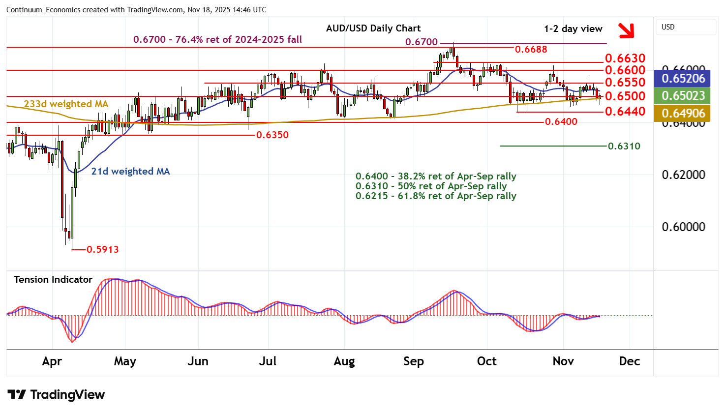 14:35 GMT - The anticipated break below congestion support at 0.6500 has bounced from 0.6465, as oversold intraday studies unwind, with prices once again trading around 0.6500. Daily readings continue to track lower and broader weekly charts are also under pressure, pointing to room for fresh tests lower. However, a close below the 0.6440 monthly low of 14 October is needed to turn sentiment negative and extend mid-September losses initially to congestion around 0.6400. Meanwhile, resistance remains at congestion around 0.6550. A close above here, if seen, will help to stabilise price action and prompt consolidation beneath further congestion around 0.6600.