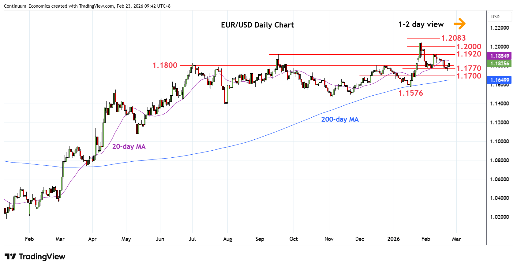 01:45 GMT - No follow-through on break of the 1.1770 support and bounce from the 1.1742 low to regain the 1.1800 level see prices back to retest resistance at the 1.1830/50 congestion. Clearance here will ease the downside pressure and expose strong resistance at the 1.1900/20 level and September 2025 year high to retest. Meanwhile, support at the 1.1770/42 congestion and low of last week should now underpin. Would take break here to further extend losses from the 1.2083, January current year high.