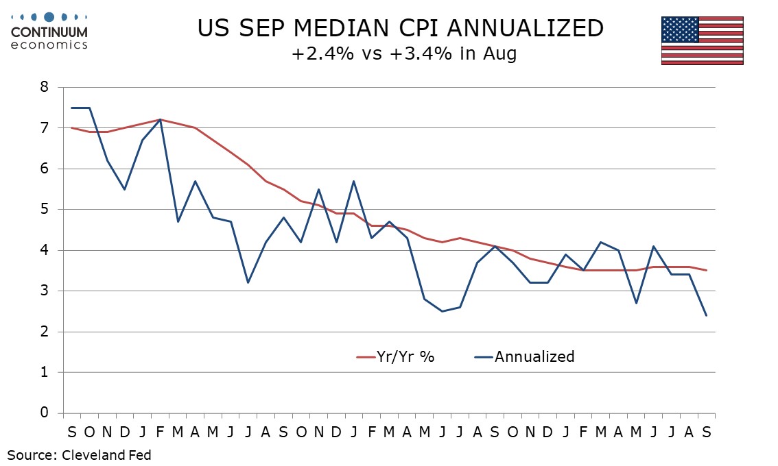 In September the FOMC stated that inflation has moved up and remains somewhat elevated. That is likely to be still valid. September CPI overall rose to 3.0% from 2.9% to reach its highest since January even if the core corrected to 3.0% after two months at 3.1%. Core PCE prices at 2.9% remain well above the 2.0% target in the latest available data, for August. Still, a 0.2% monthly core CPI increase for September after two straight 0.3% gains came as something of a relief. Owners' equivalent rent, which the Cleveland Fed's Median CPI is particularly sensitive to, led the slowing.