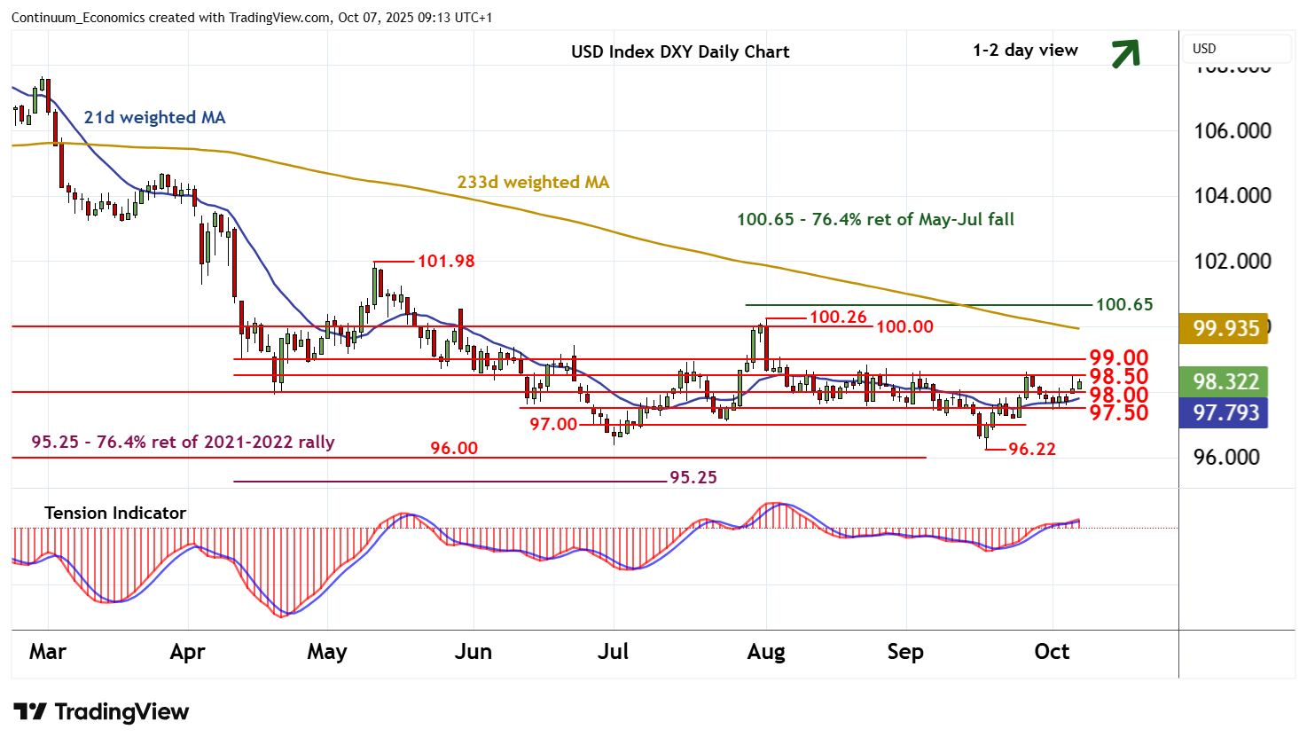 09:05 BST - Little change, as prices extend cautious trade beneath congestion resistance at 98.50. Intraday studies and daily readings are rising, highlighting room for continuation beyond here towards further congestion around 99.00. However, already overbought intraday and daily stochastics are expected to limit any initial tests in consolidation, before rising weekly charts prompt further gains. Meanwhile, support is at congestion around 98.00. A close beneath here, if seen, will turn sentiment neutral and prompt consolidation above 97.50.