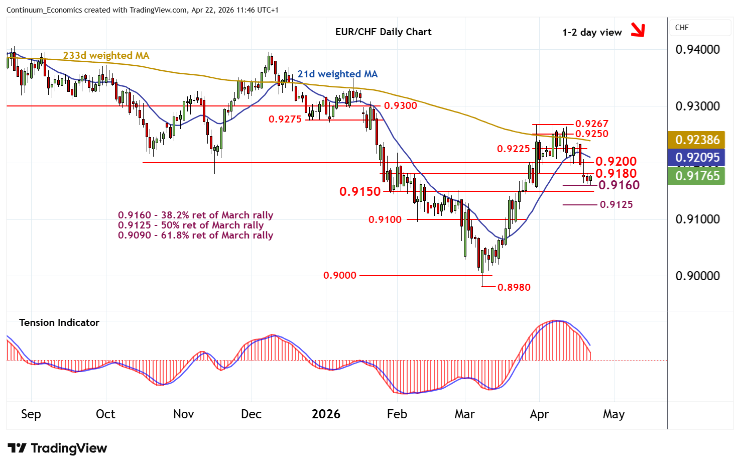 11:20 BST - Still little change, as prices extend cautious trade within the narrow 0.9160 - 0.9180 range. Daily readings continue to track lower and overbought weekly stochastics are unwinding, highlighting room for further losses in the coming sessions. A close below the 0.9160 Fibonacci retracement will add weight to sentiment and extend late-March losses below 0.9150 towards the 0.9125 retracement. Meanwhile, resistance is at congestion around 0.9180. But a close above 0.9200 is needed to help stabilise price action and prompt consolidation beneath 0.9225.