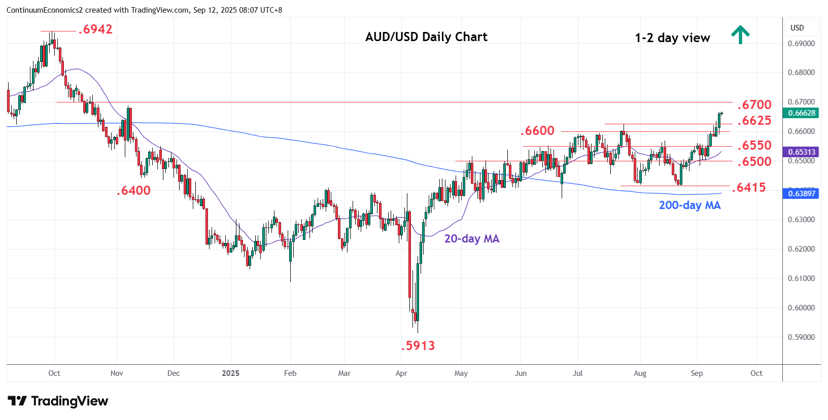 00:20 GMT - Pressing higher with break above the .6600 level and .6625 July high extending gains towards next resistance at the .6688, November high. Higher still will see room to .6700/10, congestion and 38.2% Fibonacci level. Positive daily and weekly studies suggest scope for break here to open up stronger gains. Higher will see room to the .6750/.6800 congestion area. Meanwhile, support is raised to the .6600/25 recent highs and broken trendline from the 2021 year high which should now underpin and sustain from the April low.