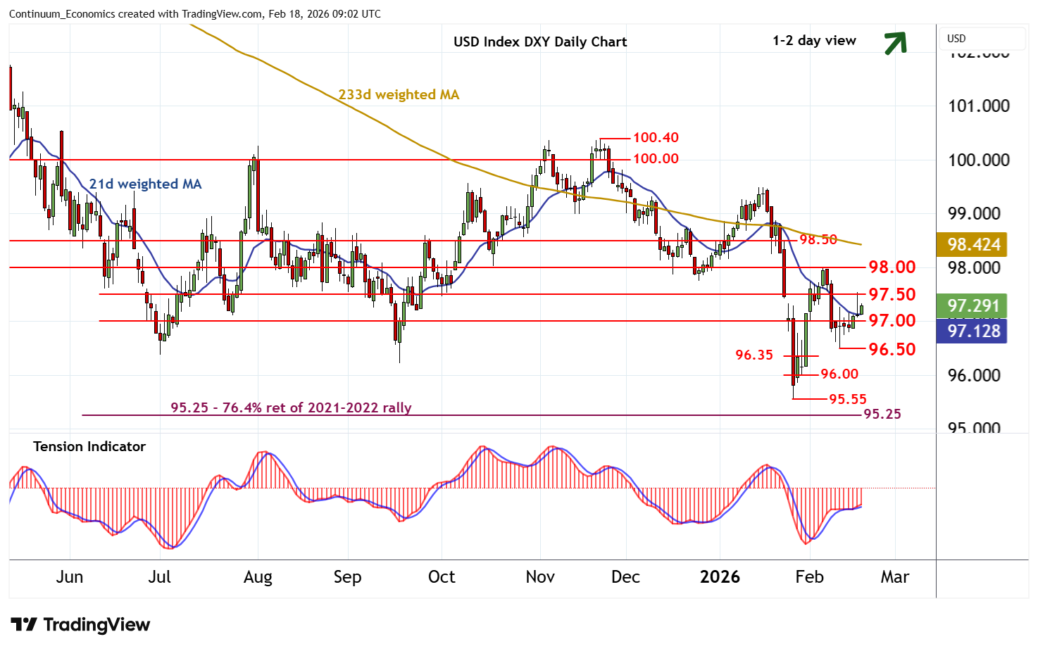 08:50 GMT - The anticipated test of congestion resistance at 97.50 has been pushed back to 97.05~, where a fresh bounce is developing. The daily Tension Indicator continues to rise, highlighting room for a retest of 97.50. But flat daily stochastics and mixed/negative weekly charts are expected to limit any fresh break in renewed selling interest beneath further congestion around 98.00. Following cautious/corrective trade, fresh losses are looked for. Support remains at congestion around 97.00. But a close below the 96.50 weekly low of 11 February is needed to turn sentiment negative and extend February losses initially towards 96.00.
