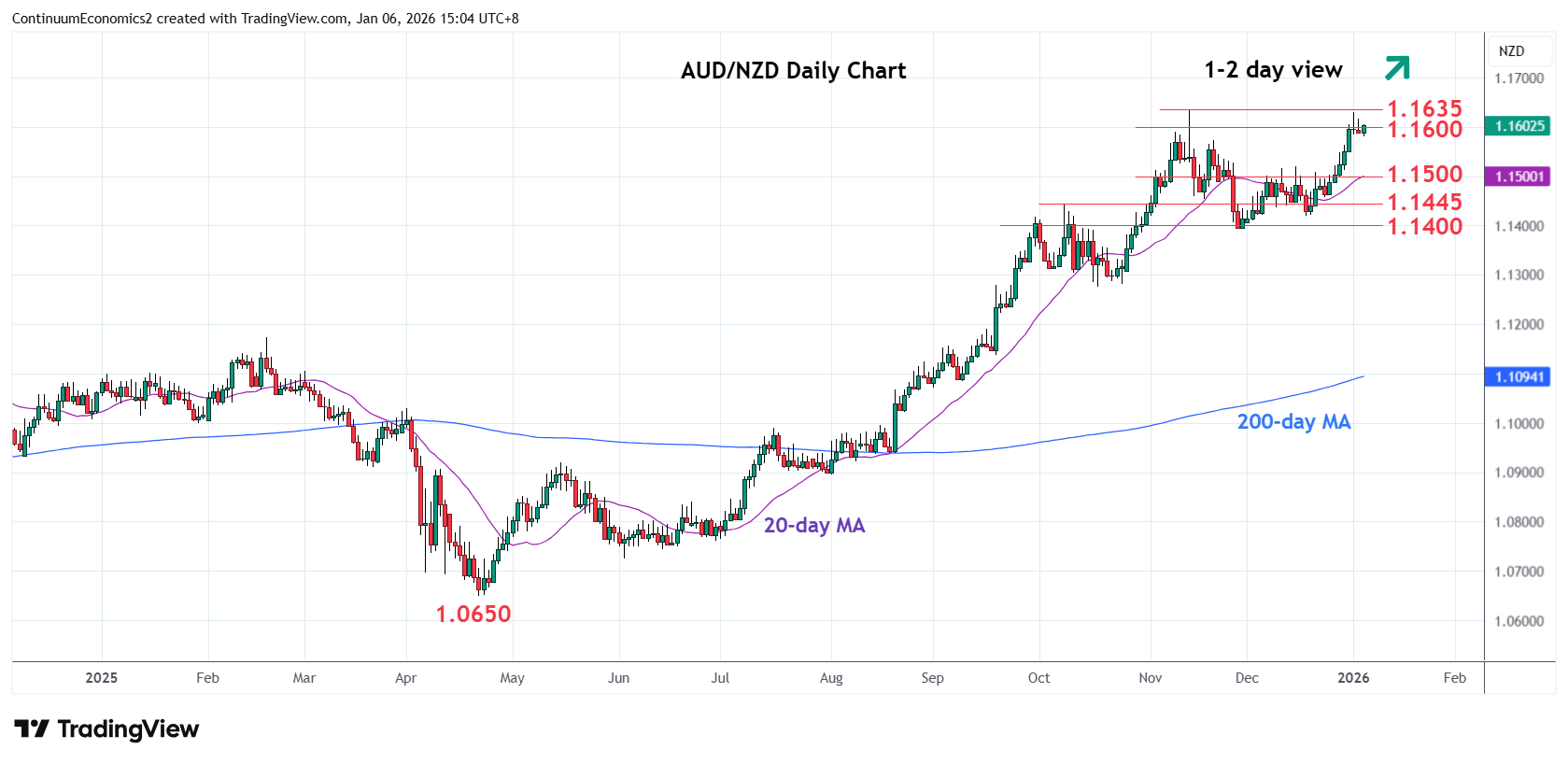 07:10 GMT - Little change, as prices consolidate retest of the 1.1635, November 2025 year high. Prices are unwinding overbought intraday and daily studies but bullish structure suggest potential for break here to further extend gains from the April 2025 year low. Higher, will see room for extension to resistance at 1.1660 and the 1.1700/50 area. Meanwhile, support is raised to the 1.1550/1.1500 congestion area which is expected to underpin. Would take break here to fade the upside pressure and see room for pullback to strong support at the 1.1445/1.1400, congestion and November low.