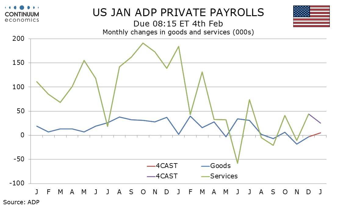 December’s ADP data was close to consistent with December’s non-farm payroll but the recent tendency has been for ADP data to underperform, with the average ADP underperformance over the last six months being 22k. We expect a 50k underperformance in January, still a narrower gap than seen in September and November. Payrolls in January look due for a rebound from recent weakness in retail, which is less of a risk in the ADP data.