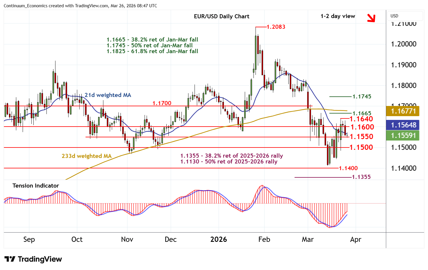 08:30 GMT - Cautious trade around 1.1600 has given way to a drift lower, with prices currently pressuring congestion support at 1.1550. Intraday studies have turned down and overbought daily stochastics are also under pressure, highlighting room for a break beneath here. However, the rising daily Tension Indicator is expected to limit initial scope in consolidation above congestion support at 1.1500, before mixed/negative weekly charts extend losses still further. Meanwhile, a close back above congestion resistance at 1.1600 would help to stabilise price action and prompt consolidation beneath the 1.1640 high of 23 March.