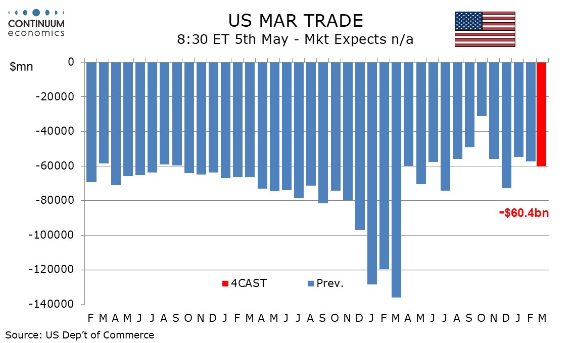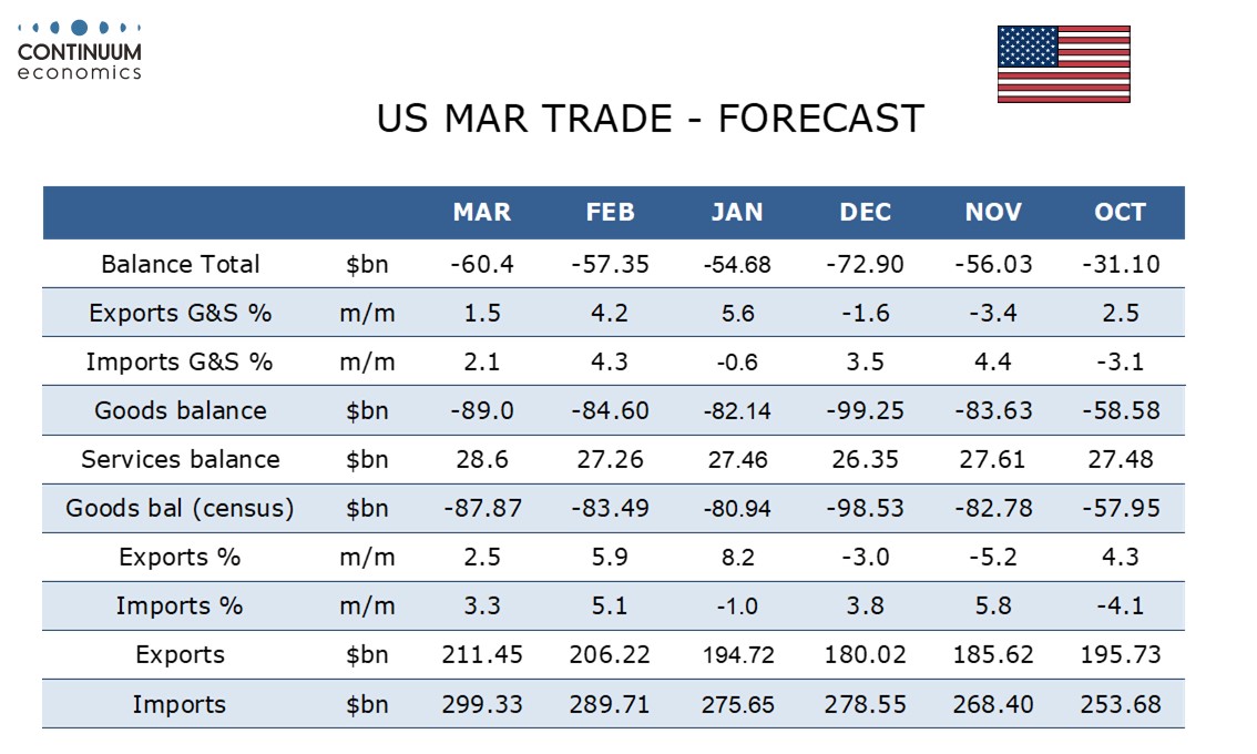 We expect a March trade deficit of $60.4bn, up from $57.3bn in February. We expect gains of 1.5% in exports and 2.1% in imports, extending respective February gains of 4.2% and 4.3% respectively.