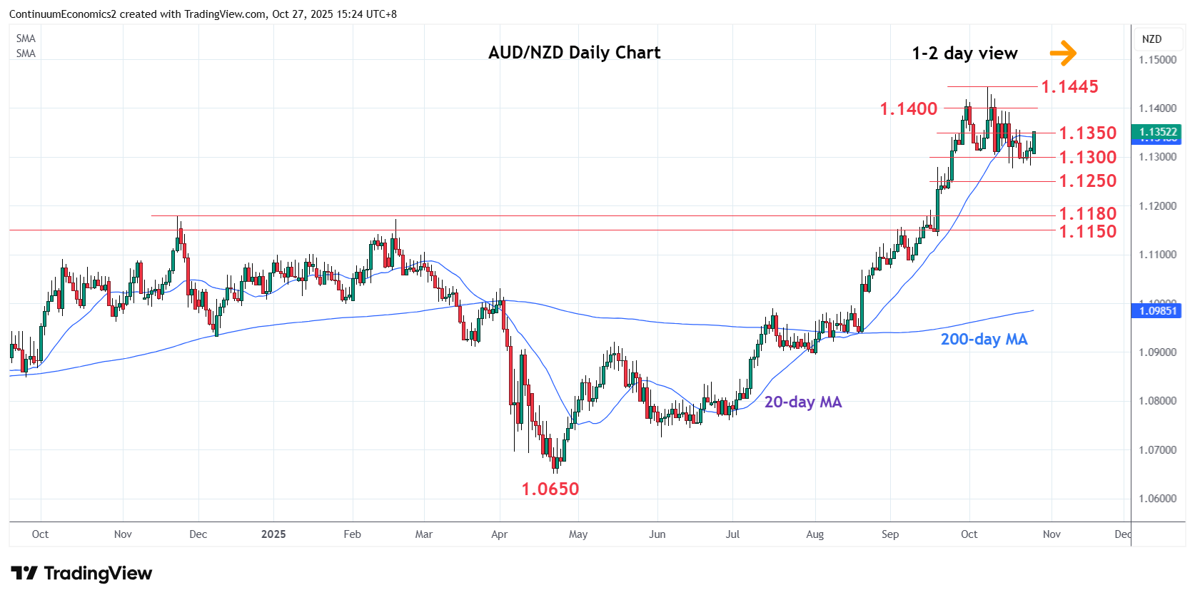 07:30 GMT - Consolidation around the 1.1300 level have given way to bounce to retest resistance at the 1.1350/70 congestion. Daily studies are unwinding oversold readings but closed above this area is needed to revive the upside focus and open up room for retest of the 1.1400 level and 1.1445 high. Clearance here will turn focus to the 1.1490, September 2022 multi-year high. Meanwhile, support at the 1.1300/1.1270 congestion area should now underpin. Would take break here to fade the upside pressure and open up room for deeper pullback to retrace the April/October rally.