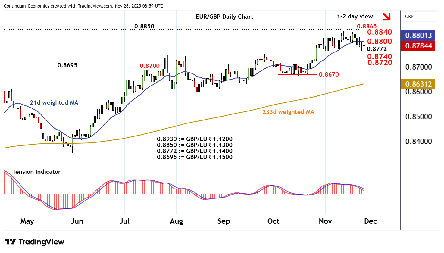 08:55 GMT - Still little change, as mixed/negative intraday studies keep near-term sentiment cautious and extend consolidation above support at 0.8772, (GBP/EUR 1.1400). Daily readings continue to track lower and overbought weekly stochastics are unwinding, highlighting a deterioration in sentiment and room for fresh losses in the coming sessions. A close below 0.8772 will add weight to sentiment and extend losses into 0.8720/40. Meanwhile, resistance remains at the 0.8800 break level. A close above here would help to stabilise price action and prompt fresh consolidation beneath resistance at the 0.8840 weekly high of 20 November and 0.8850, (GBP/EUR 1.1300).