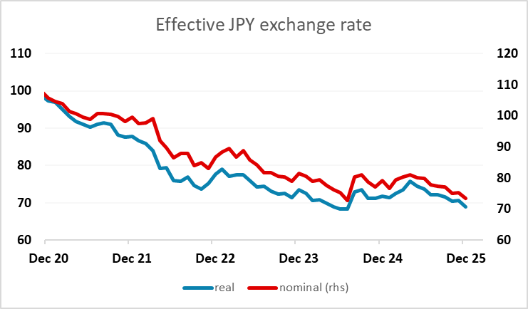 There is also a BoC meeting, but this is generally expected to produce no change in policy, and the impact on the CAD should be modest. After easing in both September and October, the BoC after its October move stated rates were now at about the right level if the economy evolved in line with its expectations. With Q3 GDP and November employment having come in stronger than expected, further easing looks increasingly unlikely, but the strength in the data is not yet convincing enough for the BoC to start considering tightening. The market is pricing the next move as being up, but only modestly and not until H2 2026, so we doubt the BoC will say anything to undermine this view.