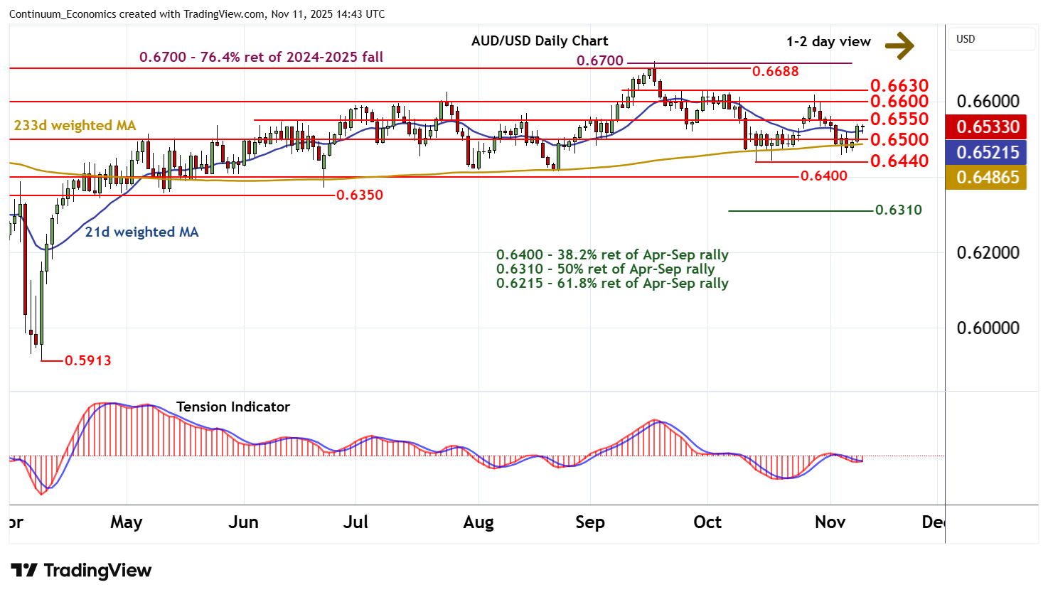 14:35 GMT - Little change, as mixed intraday charts keep near-term sentiment cautious and extend consolidation beneath congestion resistance at 0.6550. Daily stochastics are rising and the flat daily Tension Indicator is edging higher, suggesting room for a test. But mixed/negative weekly charts are expected to prompt fresh selling interest/consolidation around here. Following cautious/corrective trade, lower levels are looked for. However, a close below the 0.6440 monthly low of 14 October is needed to turn sentiment negative and extend mid-September losses initially to congestion around 0.6400.