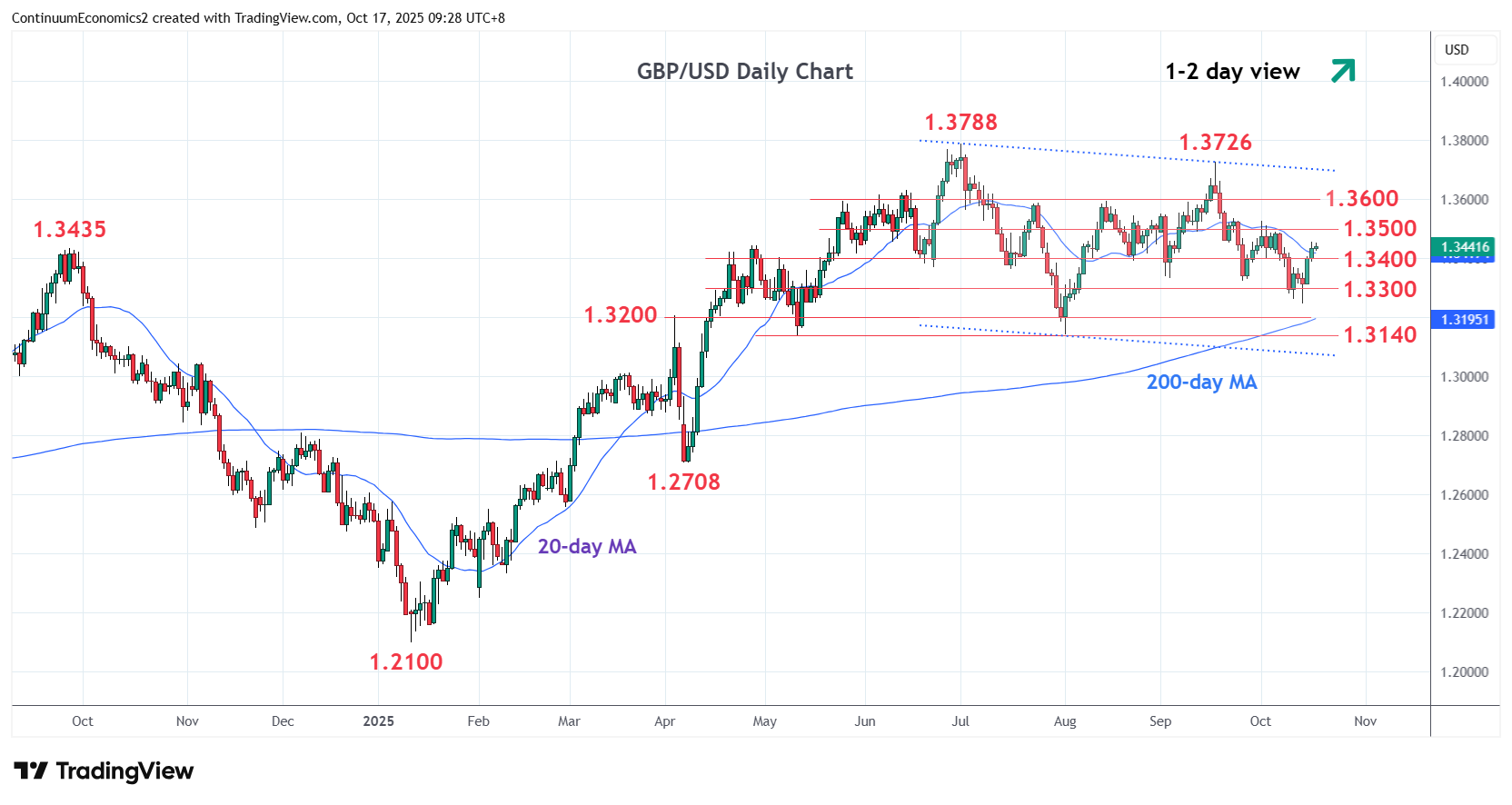 01:40 GMT - Break above the 1.3400 congestion see prices extending gains from the 1.3248 Tuesday low to retrace the September/October losses to reach 1.3455, 38.2% Fibonacci level. Daily studies are tracking higher and suggest scope for break to open up room for extension to the 1.3500/18, congestion and 50% Fibonacci level. However, gains are seen corrective and expected to give way to renewed selling pressure later. Meanwhile, support is raised to the 1.3400 level and below here will expose the 1.3300 congestion and 1.3248 low to retest.