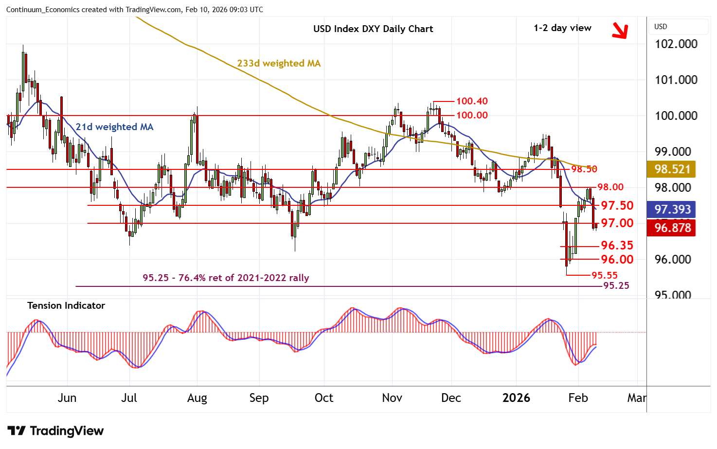 08:50 GMT - The test of 97.00 is giving way to anticipated consolidation, as oversold intraday studies flatten, with prices currently balanced around 96.85. Daily stochastics are turning down and the positive daily Tension Indicator is flattening, suggesting room for further losses in the coming sessions. A break below the 96.79 low of 9 February will add weight to sentiment and open up minor congestion around 96.35. Already oversold intraday studies could prompt short-term consolidation around here, before further losses target congestion around 96.00. Meanwhile, a close back above congestion resistance at 97.00 will help to stabilise price action and prompt consolidation beneath further congestion around 97.50.