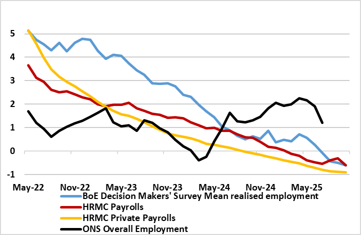 There are still questions about the reliability of official jobs data, making a focus on the now full accredited HMRC payroll data all the more important. This gauge of employment excludes self-employment) and has been showing clear declines of late, albeit some revised away. However, while have been signs that payroll weakness has ebbed this was almost solely a result of a further jump in public sector jobs, mainly in health. Indeed, public sector payrolls have risen almost full ppt in the last year, but now seem to be reversing. Regardless, private sector payroll are falling more steeply (Figure 1). To what extent this reflects the on-going impact of recent tax changes (although the jobs declines are not concentrated in the more wage sensitive service sector) is unclear. But surveys very much suggest companies are at best freezing hiring and at worse laying staff off or not replacing, this latter development helping explain the fact that vacancies have fall in every month for over three years.