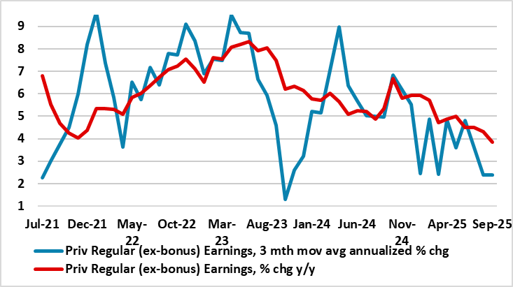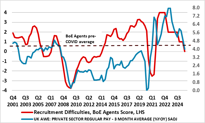 Previous signs that the labor market is haemorrhaging jobs less clearly have evaporated, with fresh and deeper falls in the more authoritative payrolls. Indeed, private sector payrolls are still falling, down almost a full ppt in y/y terms and more steeply so (Figure 1). Regardless, the latest labor market data (still bereft with reliability questions) are showing more comprehensive signs that the labor market is loosening with activity rates back to almost pre-pandemic levels. Partly as a result, the jobless rate has risen to 5.0% and, in tandem with the 40th consecutive month of falling vacancies, is very much showing that the ratio of the two has hit new highs, also consistent with a looser labor market. This helps explain the clear(er) signs of softer wage pressures (Figure 2) with the growth rate of private sector regular pay down to the lowest since end-2021, also now undershooting BoE projections and where more short-term measures suggesting even weaker growth (Figure 3). Discussion/speculation of a 50 bp BoE cut next month may intensify!
