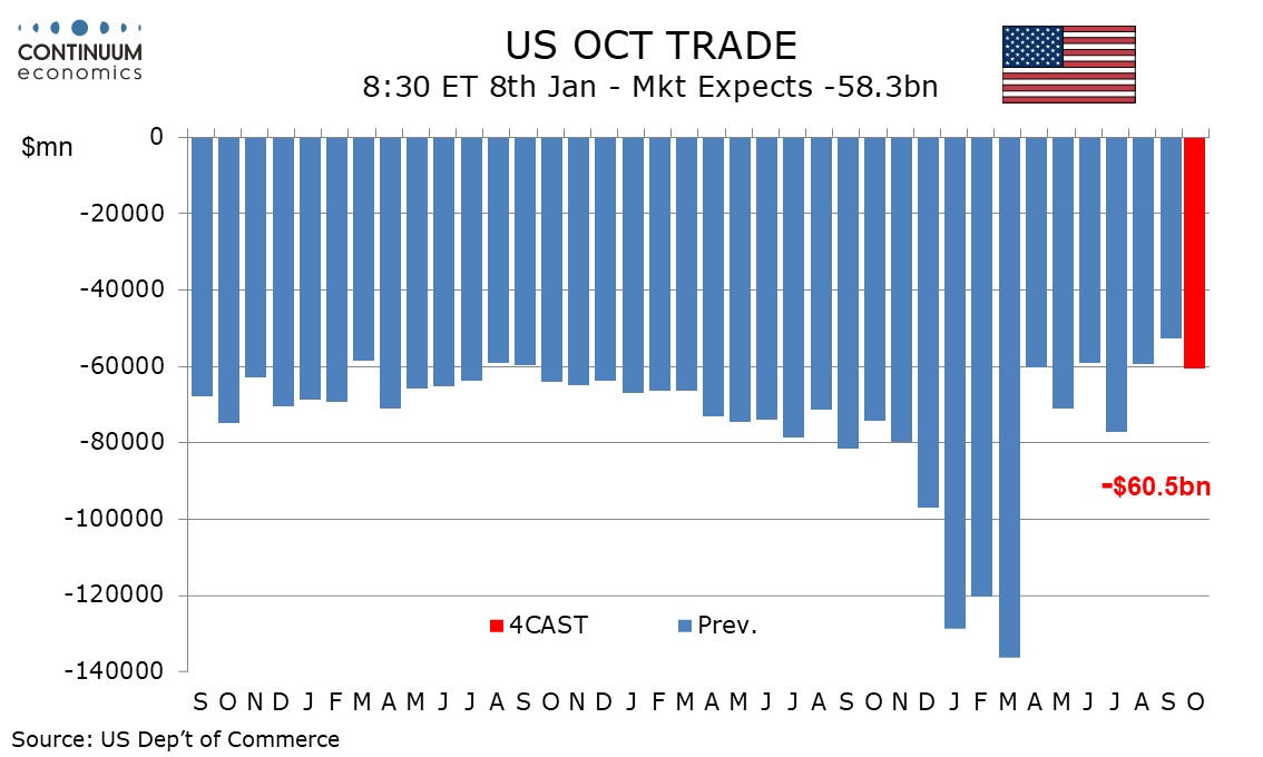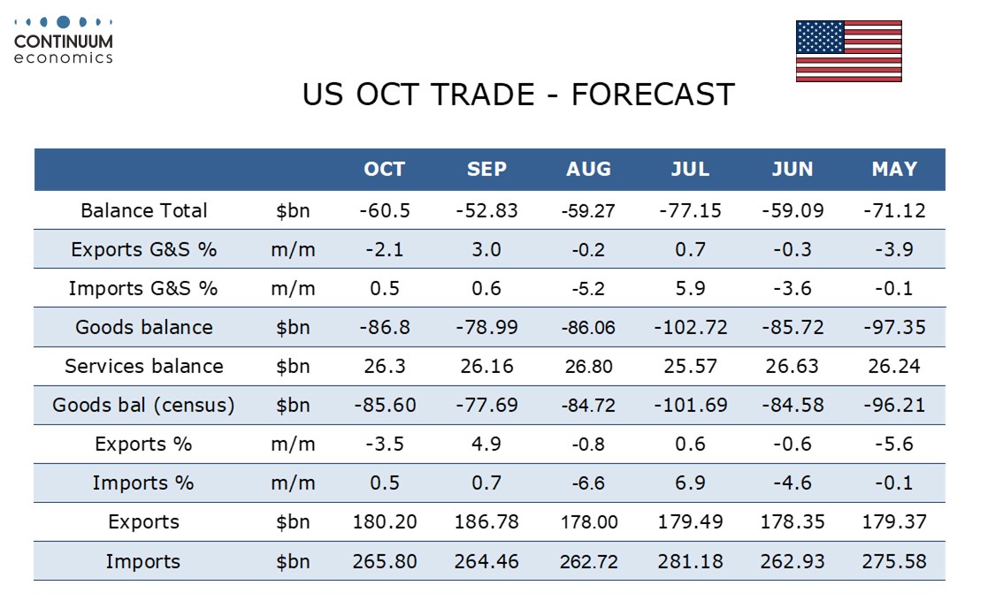 We expect an October trade deficit of $60.5bn, up from September’s $52.8bn which was the narrowest since June 2020. The deficit would be marginally above August’s $59.3bn, while remaining well below July’s $77.2bn and March’s record $136.4bn when imports surged ahead of the tariff announcement.