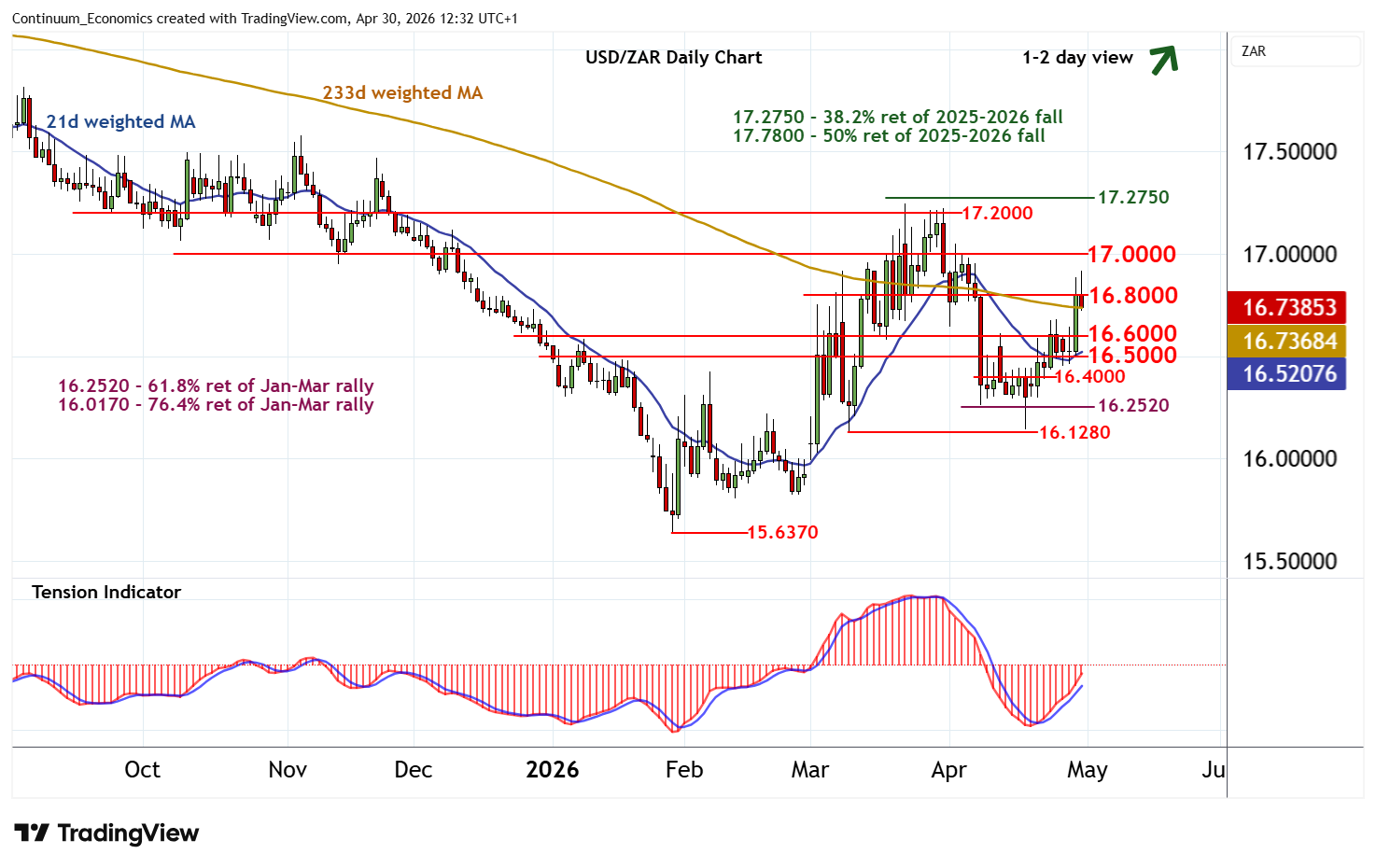 11:50 BST - Anticipated gains have reached congestion resistance at 16.8000, with prices spiking to 16.9150~ before settling lower. Negative intraday studies highlight room for a pullback. But rising daily readings and improving weekly charts should limit scope in renewed buying interest above support at 16.6000. Meanwhile, a close above 16.8000 would help to improve sentiment and extend mid-April gains towards further congestion around 17.0000.