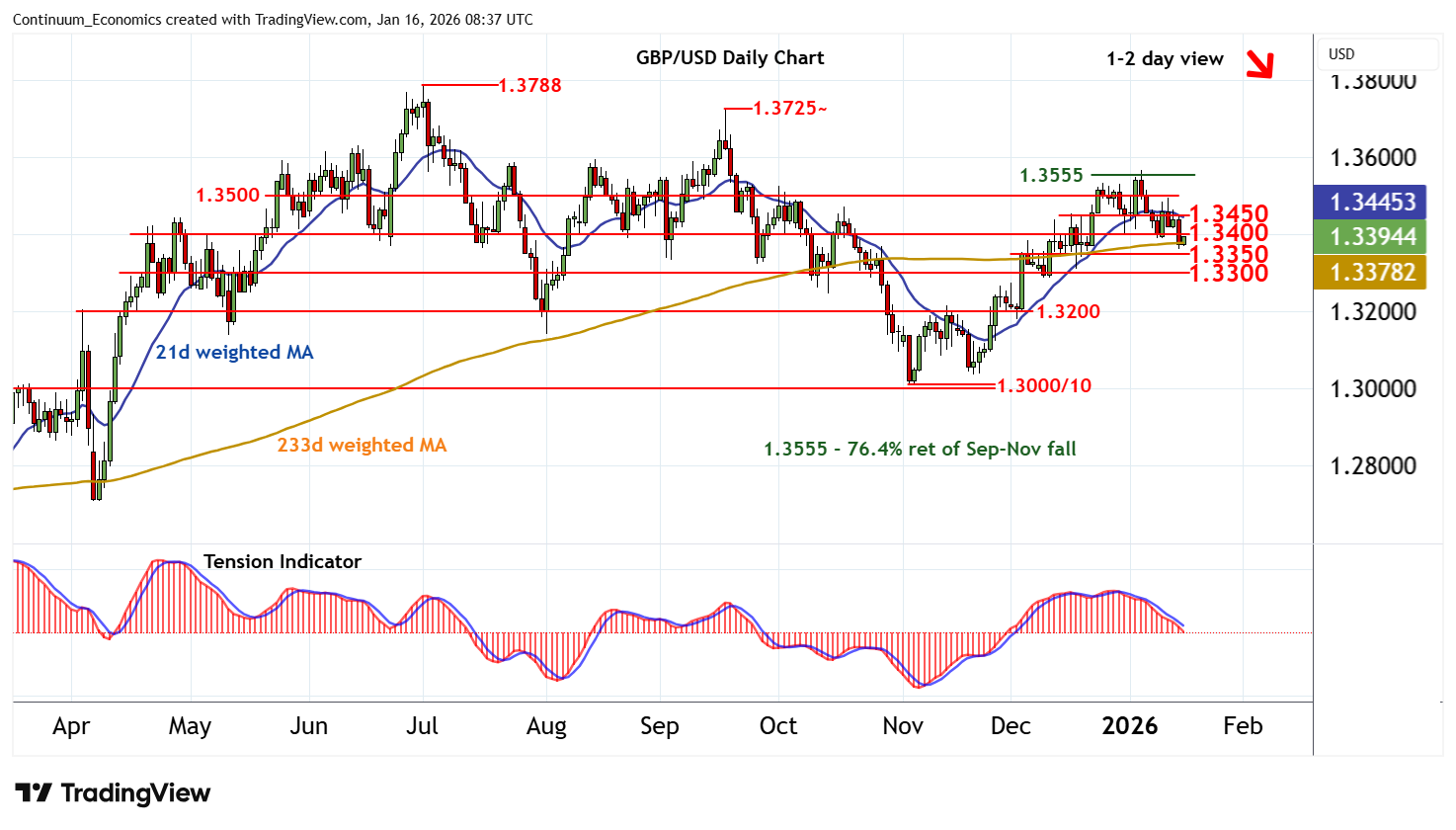 08:10 GMT - The anticipated break below 1.3400 has given way to a bounce from above support at the 1.3350 congestion lows, as oversold intraday studies unwind. Focus is turning to resistance at 1.3400. But mixed/negative daily readings and unwinding overbought weekly stochastics should limit any break in consolidation beneath further congestion around 1.3450. Following cautious trade, fresh losses are looked for. A break below 1.3350 will open up 1.3300. But the rising weekly Tension Indicator is expected to limit any initial tests in consolidation.