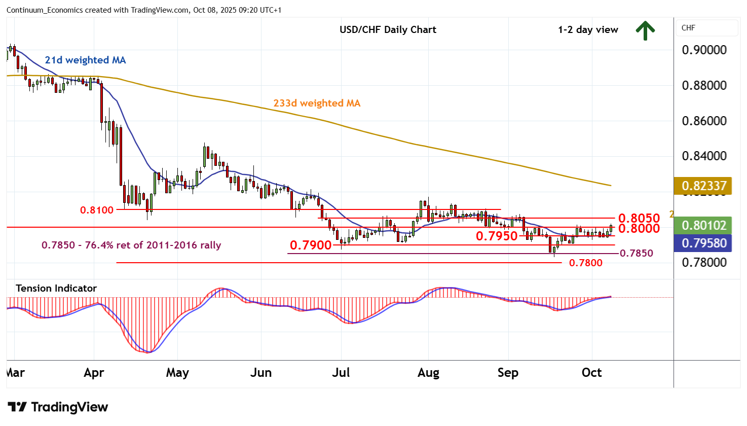 09:15 BST - Quiet trade has given way to the anticipated push higher, with prices currently pressuring congestion resistance at 0.8000. Mixed daily readings have turned higher and broader weekly charts are positive, highlighting room for further strength in the coming sessions. A close above here will open up 0.8050, with room for continuation towards congestion around 0.8100. Meanwhile, support is at the 0.7950 recent lows and extends to congestion around 0.7900. This range should underpin any immediate setbacks.