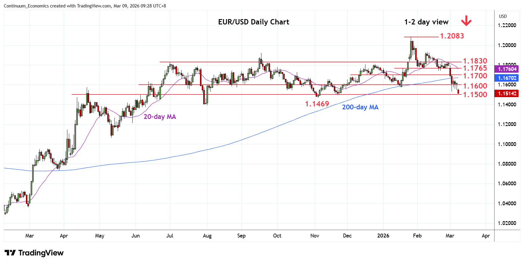 Weak start see prices extending losses through the 1.1530 low of last week to reach fresh low just above the 1.1500 level