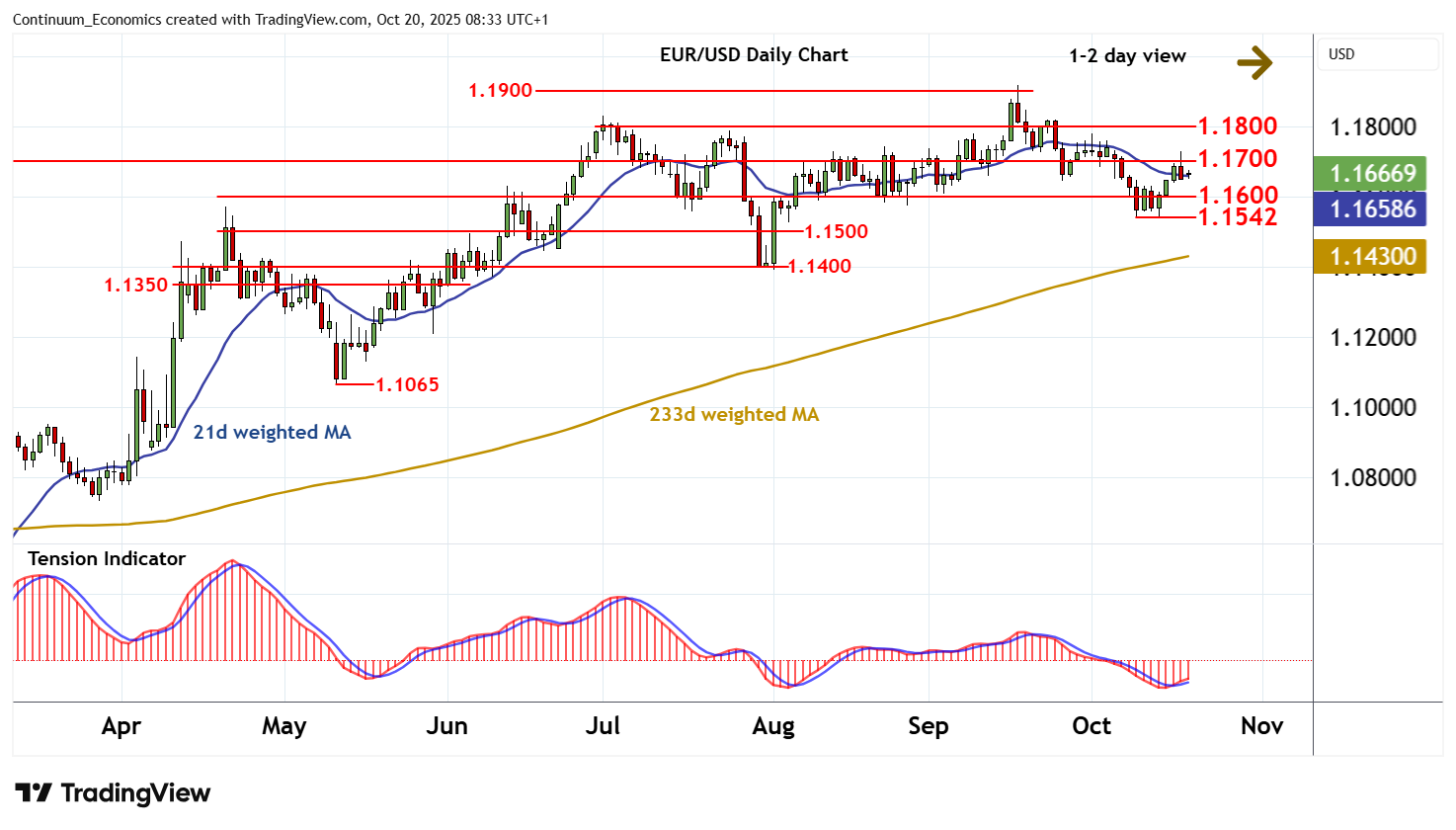 08:25 BST - The anticipated break below 1.1700 has reached 1.1650, where fresh consolidation is developing. Intraday studies are mixed/negative, suggesting room for a test beneath here. But rising daily readings are expected to limit initial scope in consolidation above congestion around 1.1600. Meanwhile, resistance is at congestion around 1.1700 and extends to the 1.1728 weekly high of 17 October. A close above here is needed, not yet seen, to improve sentiment and extend October gains towards congestion around 1.1800.