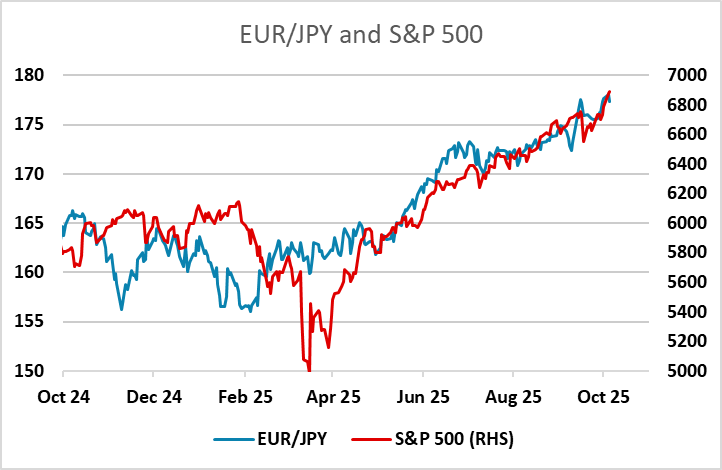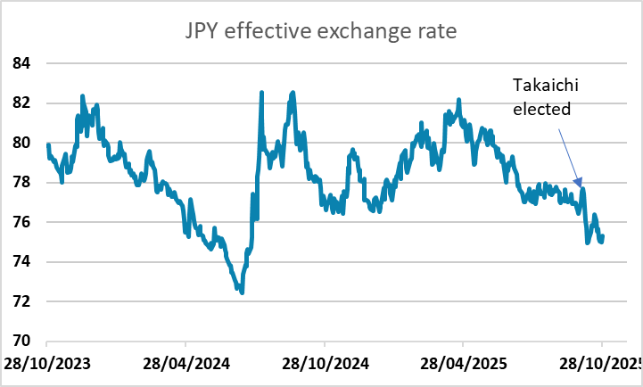 But the market assumption that the BoJ will stand pat because the new government favours more expansionary monetary policy looks misguided. Indeed, we believe a BoJ hike is now more rather than less likely to hiem than it was before the new administration came to power. First, it is likely that fiscal policy will be more expansionary under the new government, allowing a faster pace of monetary tightening consistent with the inflation target. Second, the JPY has weakened substantially since the election of Takaichi, and that will increase inflation, other things equal, plus a BoJ hike might be seen as desirable to help stabilise the currency. Third, the BoJ may want to emphasise its independence, although most expect a less confrontational approach to relations with the new government. On balance, we expect a hike to be delayed until December, but even if it is, if Ueda prepares a rate hike with his comments, the JPY could benefit, as even a December hike is a little less than halfway priced in. For USD/JPY, we therefore see the risks as mainly on the downside, even if there is a knee-jerk positive reaction to a no change decision.