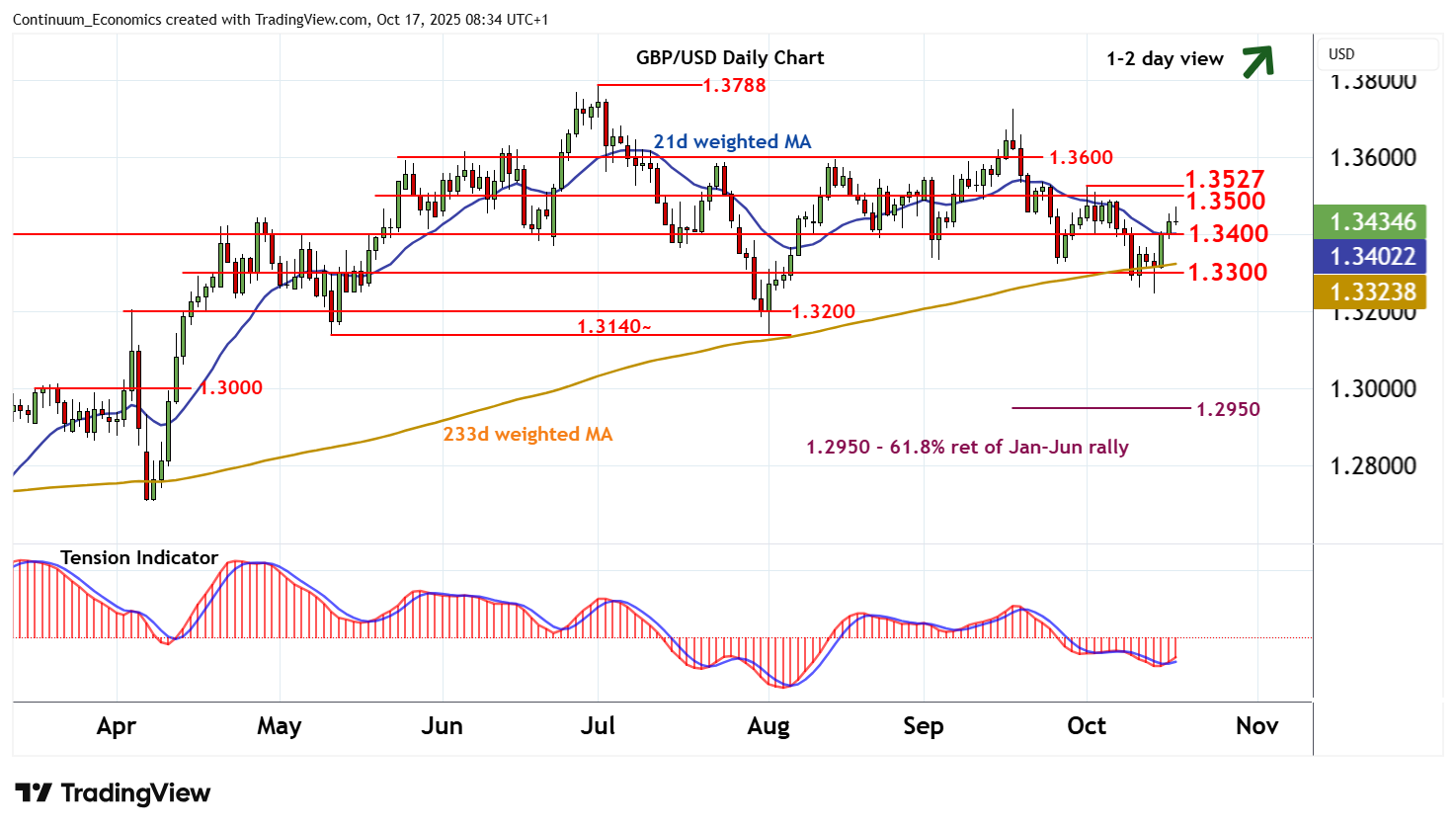 08:10 BST - Cautious trade has spiked to 1.3470~, before settling back in range as intraday overbought intraday studies unwind. A minor pullback towards congestion support at 1.3400 is possible. But rising daily stochastics and the improving daily Tension Indicator are expected to limit any tests in renewed buying interest. Following cautious trade, focus is expected to turn to congestion resistance at 1.3500 and the 1.3527 weekly high of 1 October. But mixed weekly charts could limit any initial tests in consolidation. Meanwhile, a break below 1.3400, if seen, should give way to consolidation above 1.3300.