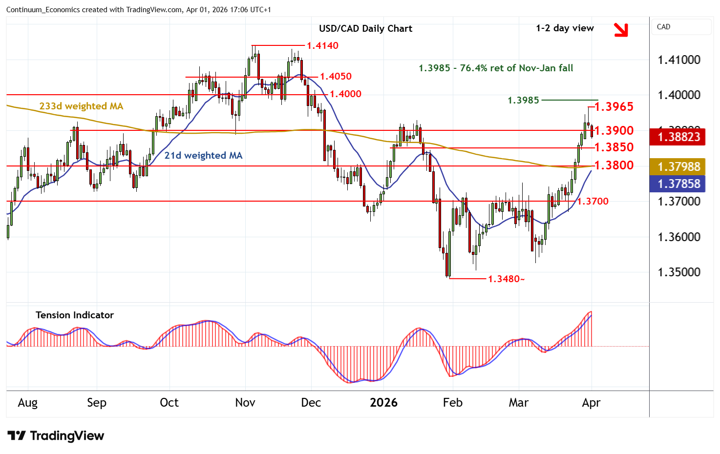 16:45 BST - Cautious trade around 1.3900 has given way to a USD- and CAD-driven pullback, with prices currently trading around 1.3880. Intraday studies are negative and overbought daily stochastics are unwinding, highlighting room for deeper losses towards congestion support at 1.3850. The rising daily Tension Indicator and positive weekly charts should limit any deeper losses, however, with congestion around 1.3800 to underpin tests below 1.3850. Meanwhile, resistance is lowered to congestion around 1.3900. But a close above the 1.3965 current year high of 31 March is needed to turn sentiment positive and extend January gains beyond congestion resistance at 1.4000.