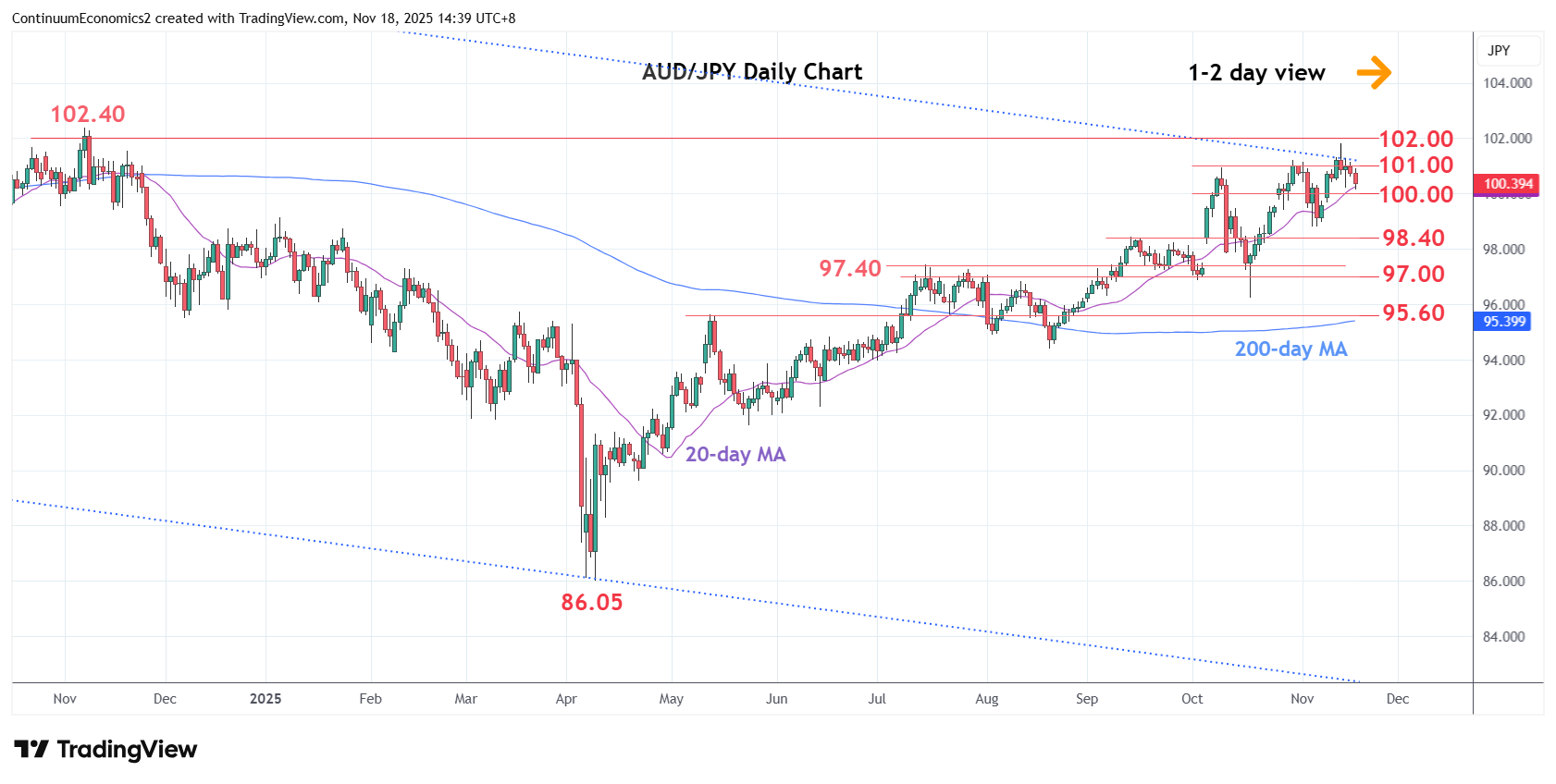 06:40 GMT - Drifting lower in consolidation from the 101.82 high as prices unwind overbought intraday and daily studies. Weekly studies are stretched as well and suggest further gains likely to stalled beneath the 102.40, November 2024 high. Meanwhile, support at the 100.00 congestion now underpin. Would take break here to open up room for deeper pullback to retrace gains from the April current year low to strong support at 99.00/98.80, congestion and 5 Novermber low. Lower still, will see room to 98.40/97.40, September/July highs.