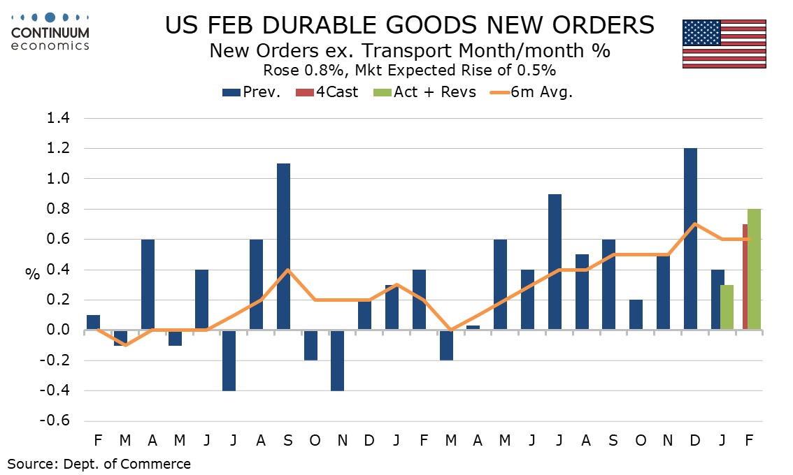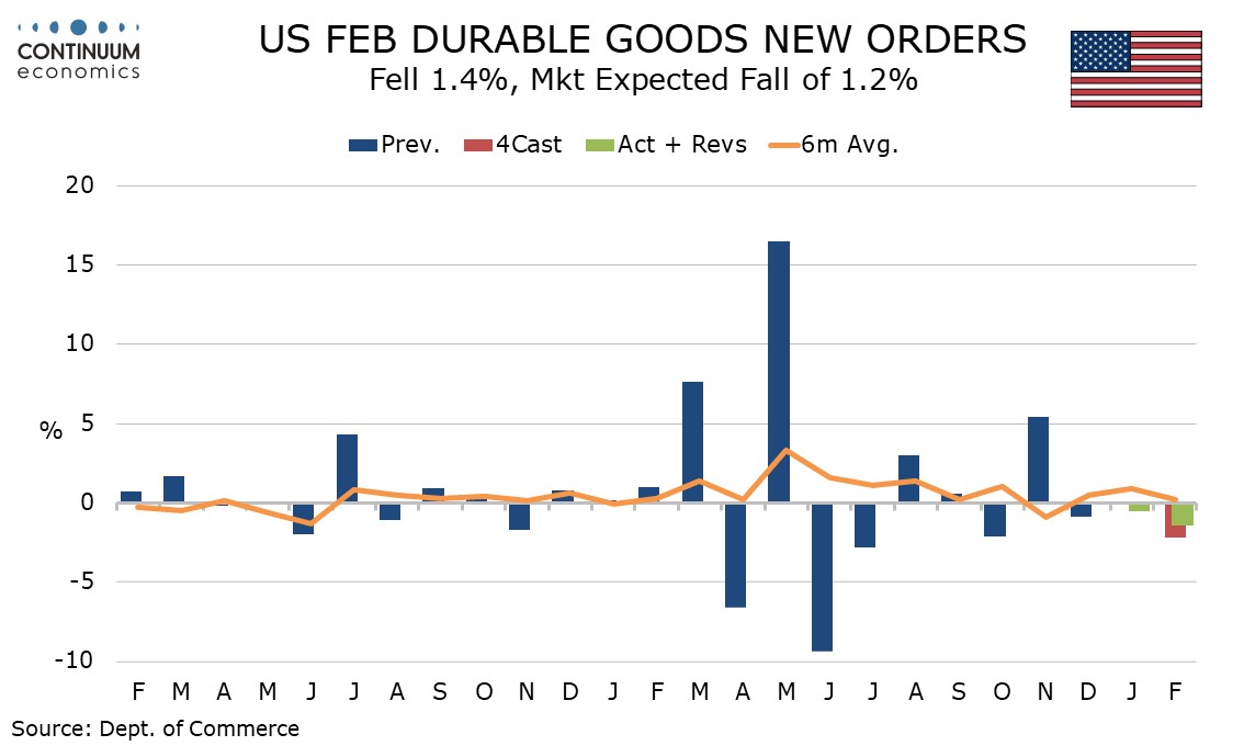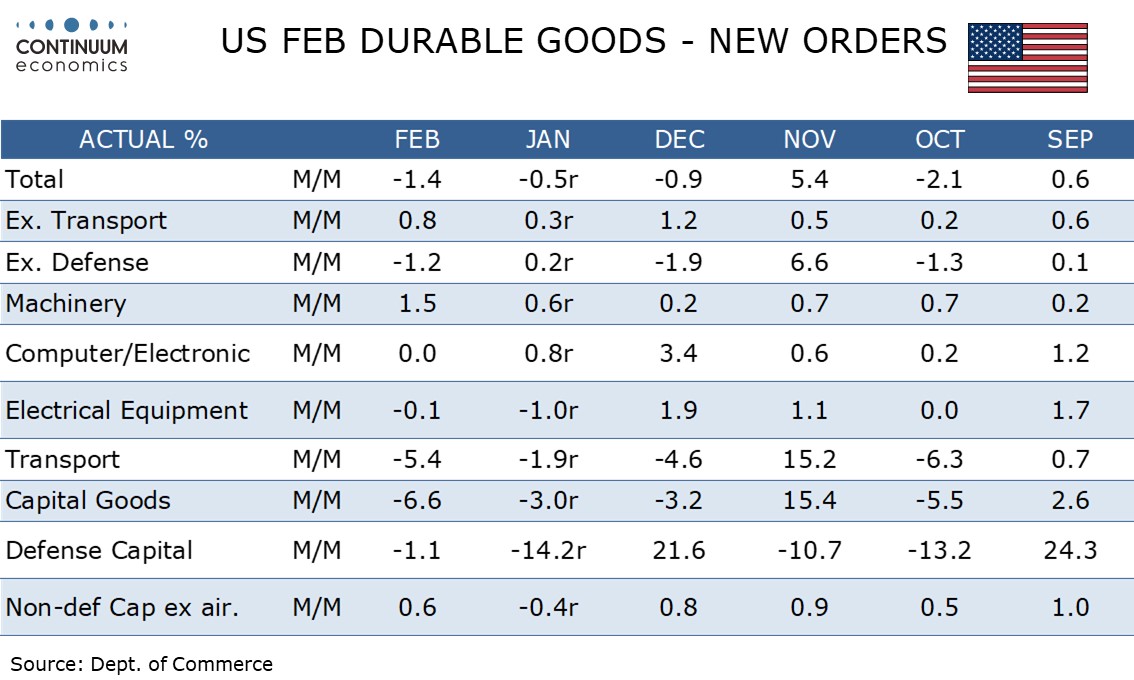February durable goods orders are in line with expectations overall with a 1.4% decline led by the volatile aircraft sector correcting from recent strength, but a slightly stronger than expected ex transport increase of 0.8% maintaining a positive trend, indicating a positive business investment picture.