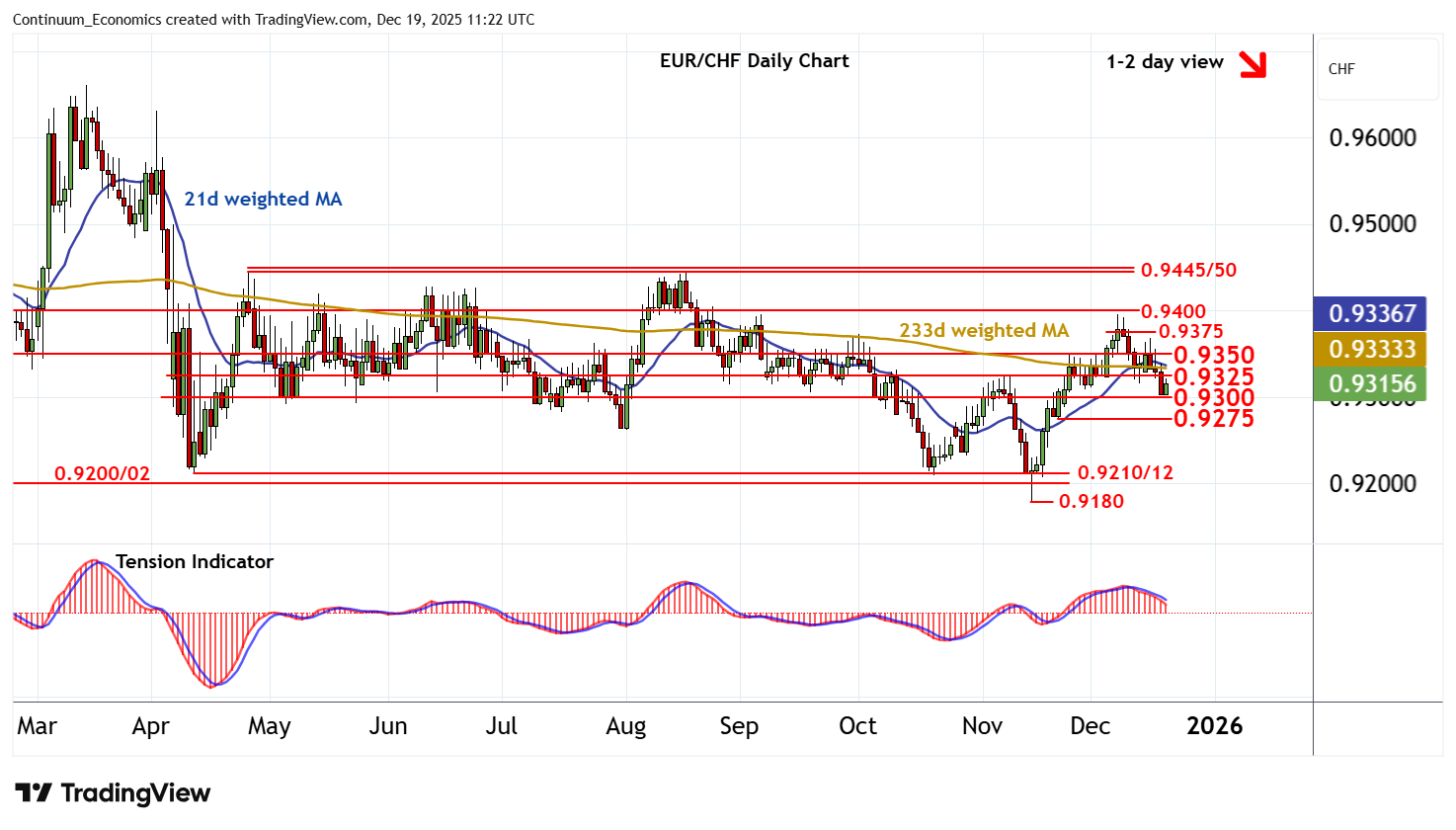 11:05 GMT - Anticipated losses have reached congestion support at 0.9300, where mixed intraday studies and flattening oversold daily stochastics are prompting short-term reactions. The daly Tension Indicator continues to point lower, highlighting room for a later break. But mixed weekly charts are expected to limit scope in renewed buying interest/consolidation above the 0.9275 low of 21 November. Meanwhile, resistance is lowered to congestion around 0.9325. A close above here would help to stabilise price action and give way to consolidation beneath further congestion around 0.9350.