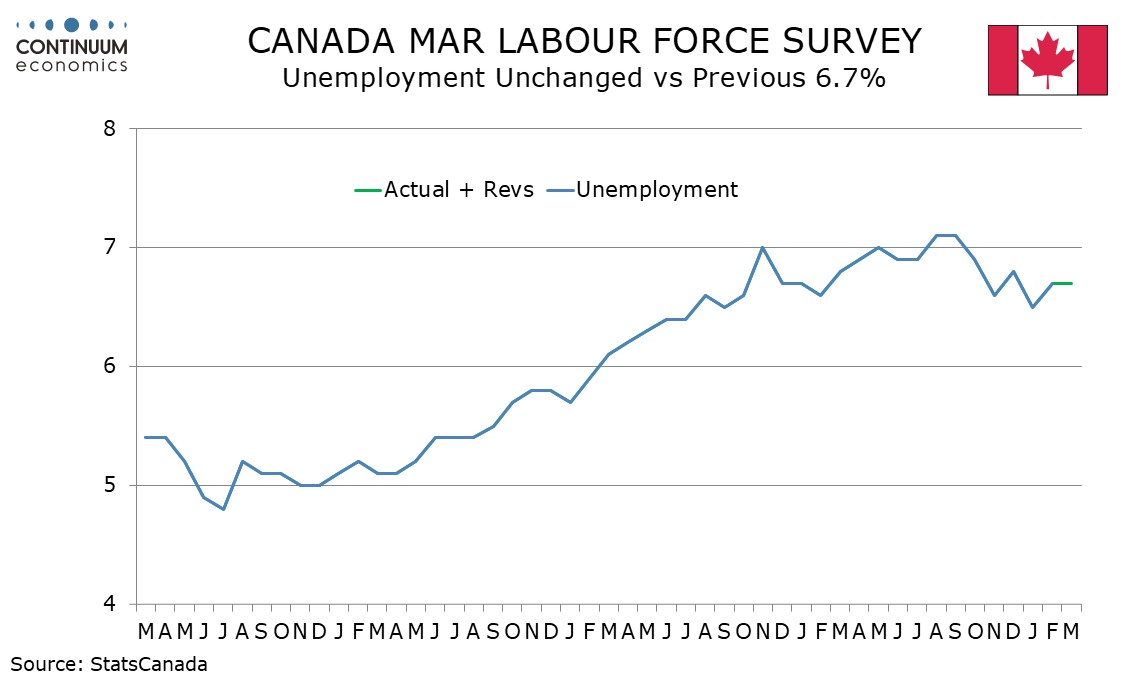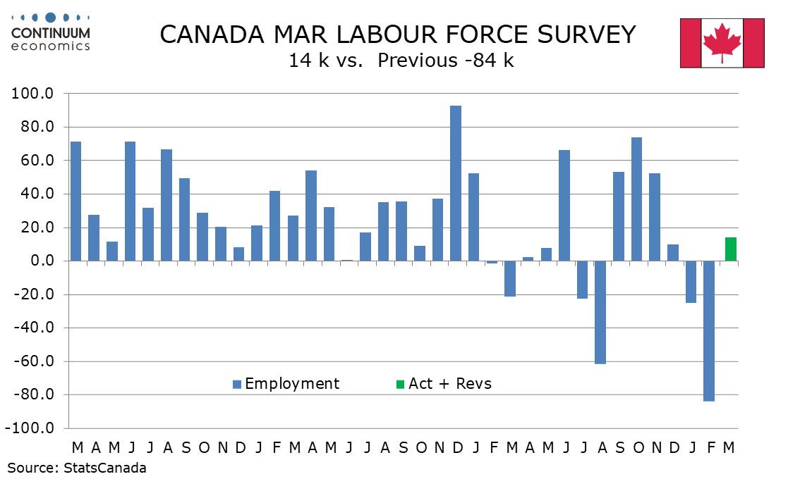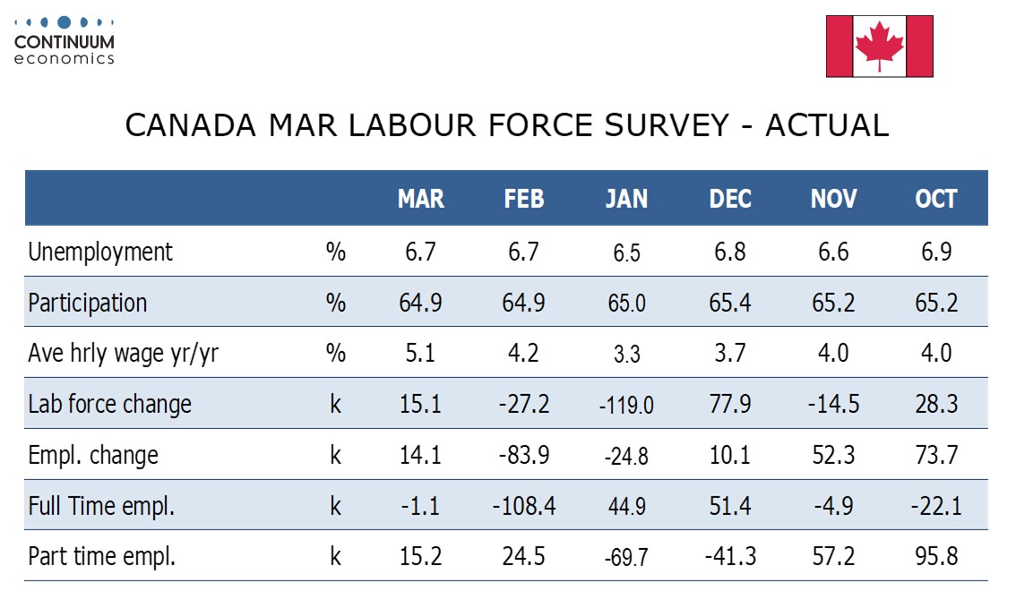 Canada’s March employment gain of 14.1k is in line with market expectations and not very impressive after a plunge of 83.9k in February that may have been exaggerated by weather. Unemployment was unchanged at 6.7% as expected. There was an upside surprise in wage growth, the hourly rate for permanent employees up by 5.1% yr/yr, versus 4.2% in February.